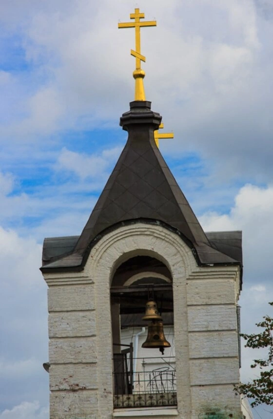 Колокольня является неотъемлемой частью храмового комплекса и выполняет свою сакральную функцию — созывает православных христиан на богослужение. Золотой крест, венчающий строение, символизирует победу жизни над смертью и напоминает о искупительной жертве Спасителя. Снимок передает спокойную и благодатную атмосферу этого святого места, являющегося объектом культурного наследия и центром духовной жизни верующих.