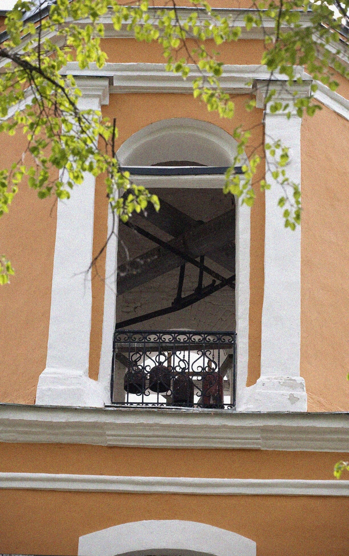 На снимке чётко виден фрагмент стены колокольни, выполненной из кирпича и окрашенной в тёплые охристые тона, которые гармонично сочетаются с белыми декоративными элементами. Выразительные пилястры и арочный проём, обрамлённые белым камнем, придают сооружению строгость и величие. В арочном проёме открытой звонницы размещены колокола, подвешенные на прочном кованом ограждении, готовые в любой момент возвестить округу благой вестью.