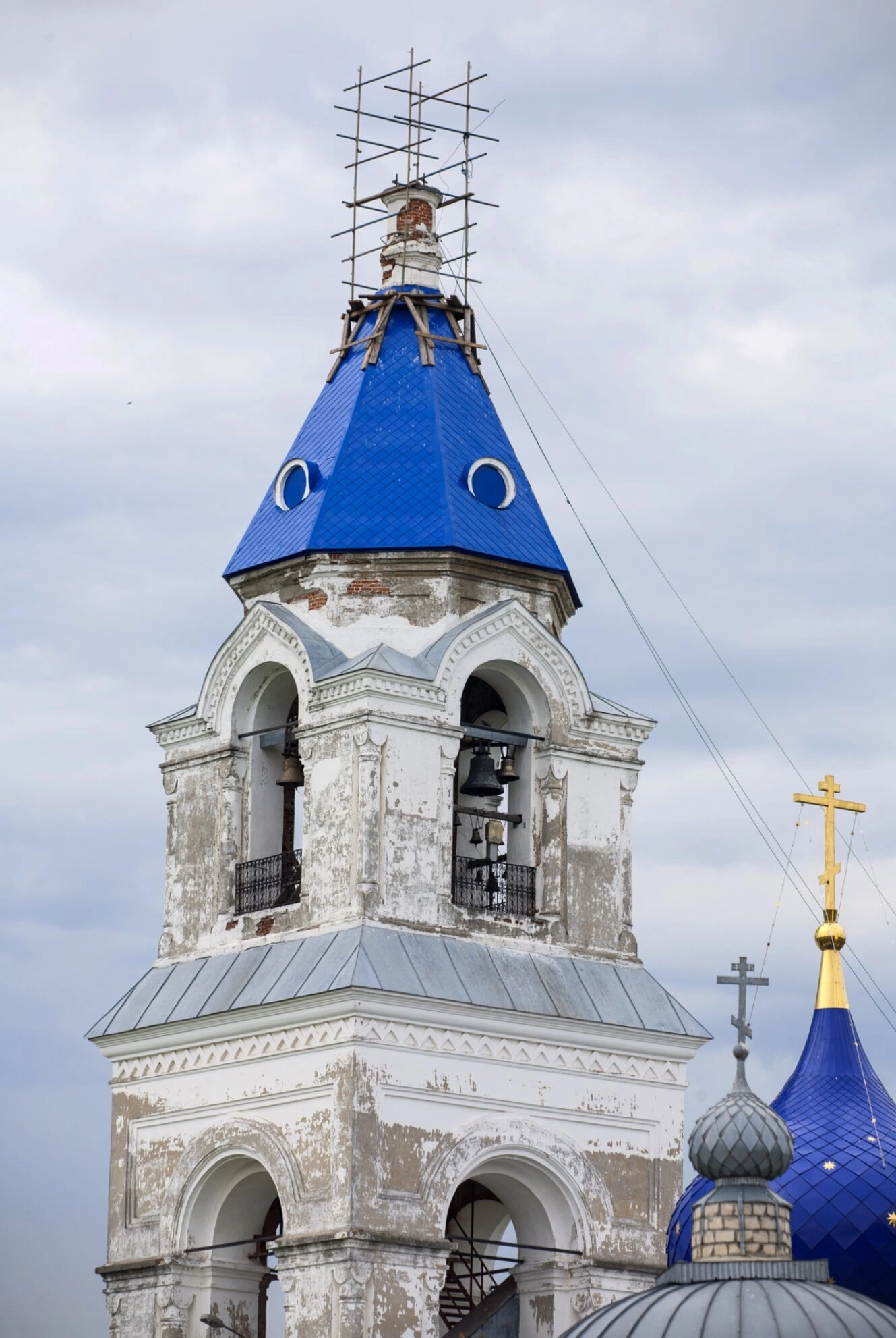 Верхний ярус колокольни оборудован металлическими ограждениями, обеспечивающими безопасность во время звона. Венчает сооружение изящный синий купол, покрытый черепицей и украшенный двумя круглыми окнами, обрамлёнными белыми декоративными элементами. Особое внимание привлекают строительные леса, установленные над куполом, что свидетельствует о проводимых реставрационных работах по сохранению этого духовного наследия.