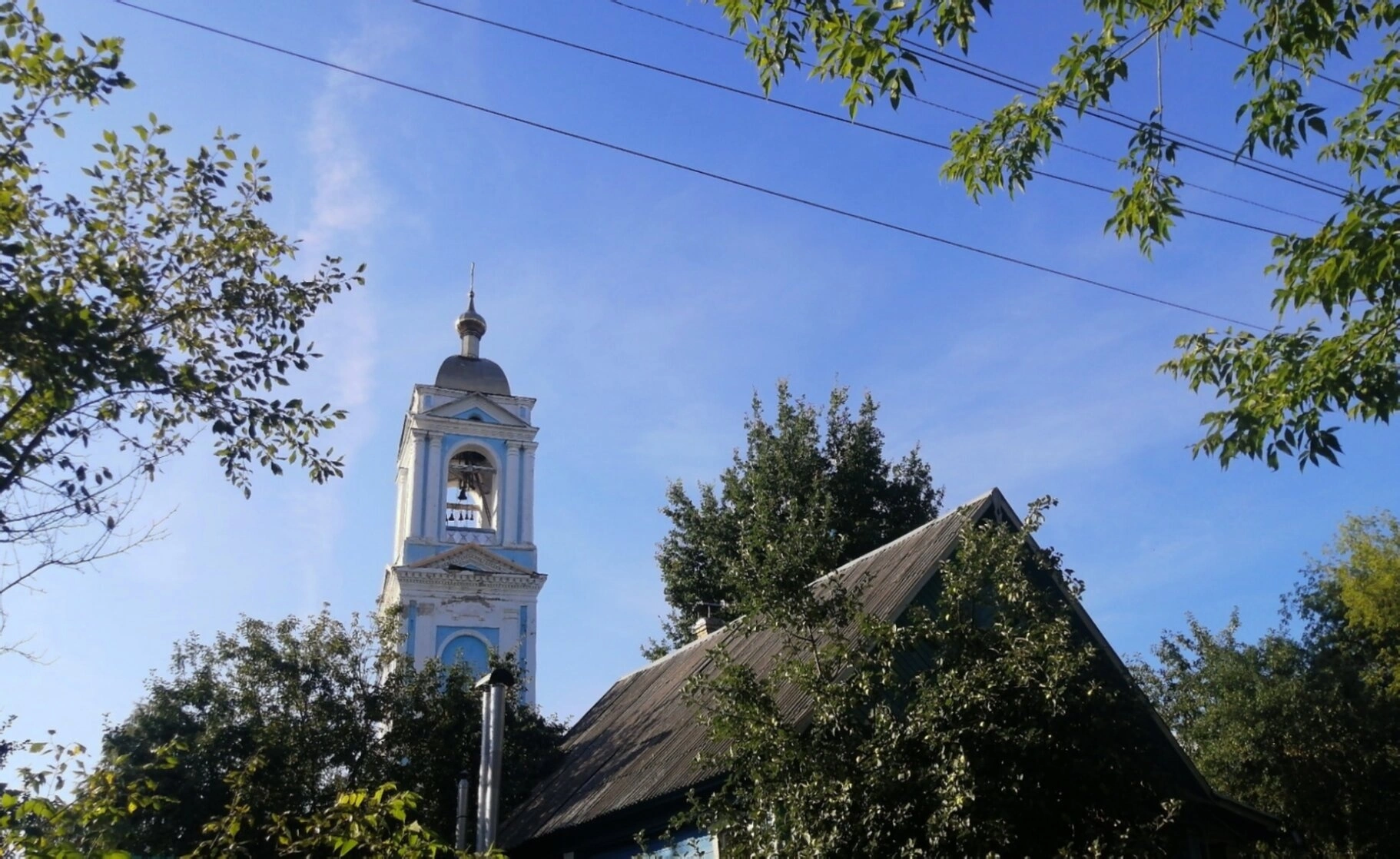 Колокольня представляет собой величественное сооружение, увенчанное синим куполом с установленным православным крестом. Фасад украшен изящными арочными проёмами и декоративными элементами, выполненными в белом цвете, что создаёт гармоничный контраст с основным объёмом сооружения. За колокольней просматриваются кроны деревьев и часть основного храмового здания, что позволяет оценить масштаб всего церковного комплекса.