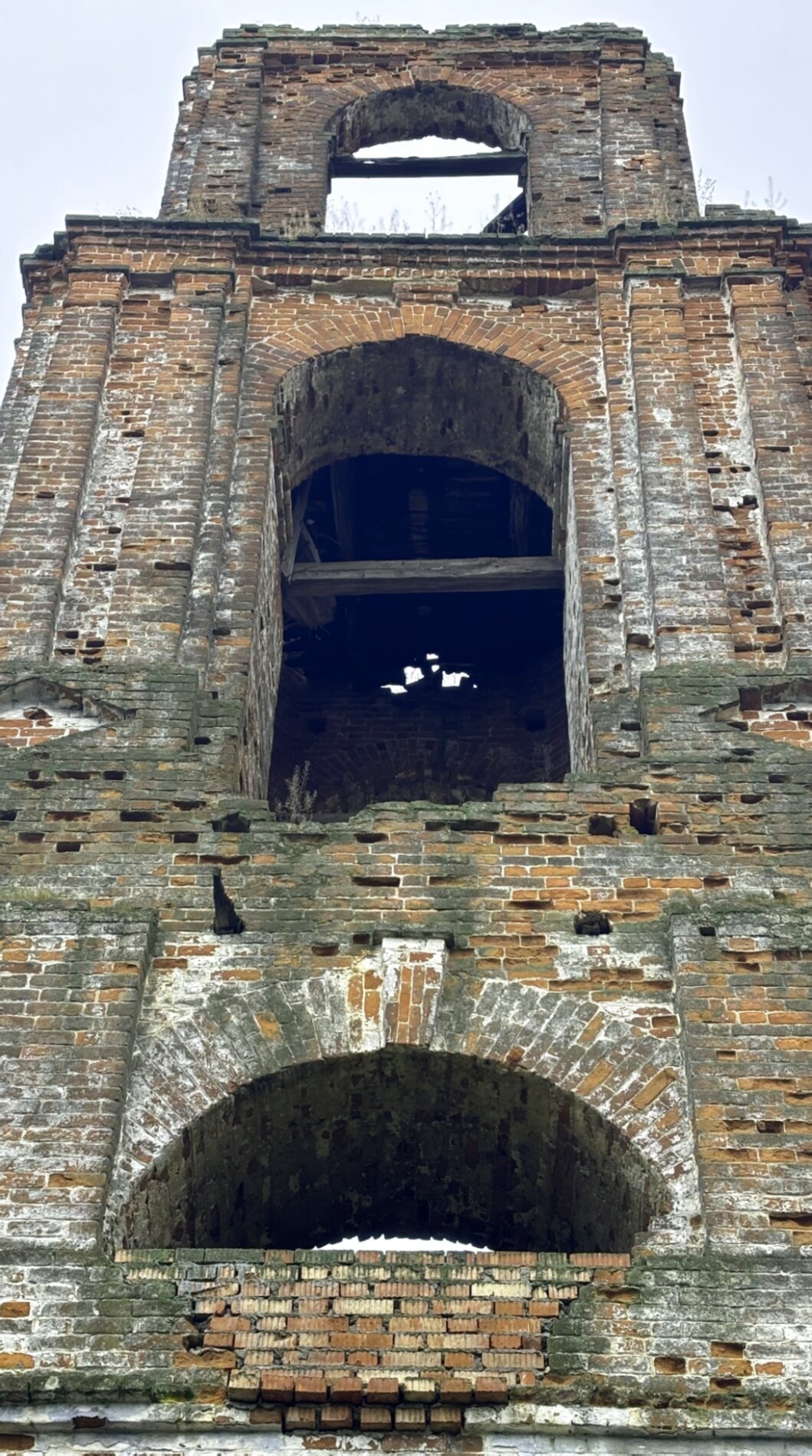 Колокольня возведена из красного кирпича, ныне сильно обветшавшего и покрытого слоями мха и природных наслоений. Кирпичная кладка имеет многочисленные повреждения: видны глубокие трещины, выбоины и участки частичного обрушения. Архитектурное решение включает три яруса арочных проемов, характерных для русской церковной архитектуры. Нижний ярус содержит крупный арочный проем, ныне частично обрушенный, с фрагментами сохранившейся кладки внутри. На среднем ярусе расположен аналогичный проем, где различимы остатки деревянной балки - вероятно, элемент прежних конструкций. Верхний ярус представлен полностью открытым арочным проемом, через который видно небесное пространство. Венчающая часть колокольни утрачена, кровля отсутствует.