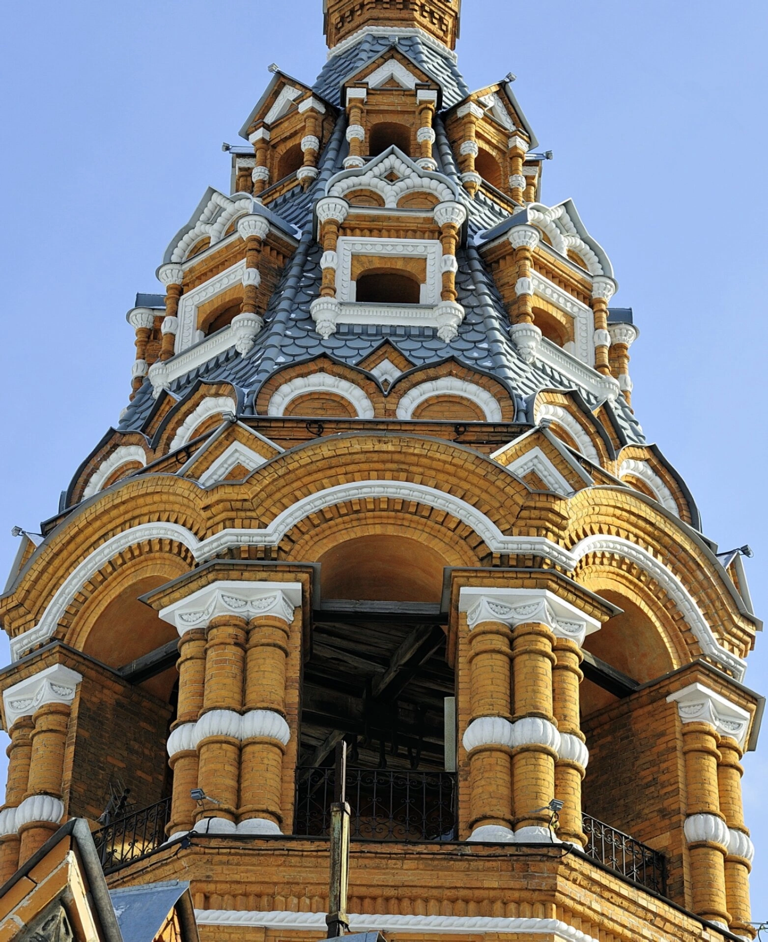 На представленной фотографии запечатлена колокольня храма Сретения Господня в историческом центре Ярославля. Кадр крупно показывает верхний ярус звона и восьмигранный шатёр, что позволяет рассмотреть тонкие детали архитектуры. Основной материал — красный кирпич, который контрастирует с белокаменными или оштукатуренными декоративными элементами. Арочные проёмы яруса звона обрамлены выразительными белыми наличниками, а углы акцентированы парными колоннами. Кирпичная кладка выполнена с высокой точностью, включая фигурные кирпичи для создания рельефных арок и карнизов. Шатёр, покрытый серым материалом, напоминающим лемех, украшен рядами белых декоративных элементов по периметру основания и на гранях. Венчает композицию небольшой барабан с главкой.