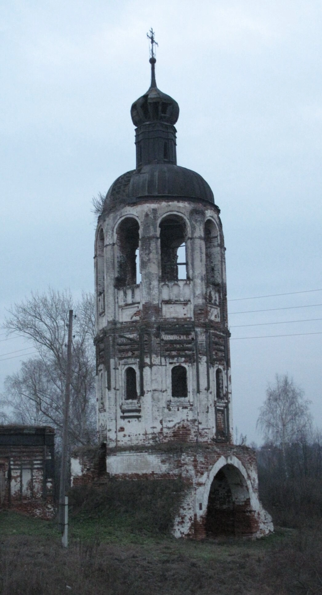 Верхний ярус колокольни, где ранее размещалась звонница, проёмы которого ныне зияют пустотой, венчается массивным куполом и главкой с сохранившимся крестом. Этот крест, возносящийся к небу, символически свидетельствует о победе вечной жизни над тленом и забвением. Состояние памятника удручающее: утрачены кровли, обвалилась штукатурка, обнажившая кирпичную кладку, оконные проёмы лишены заполнений.