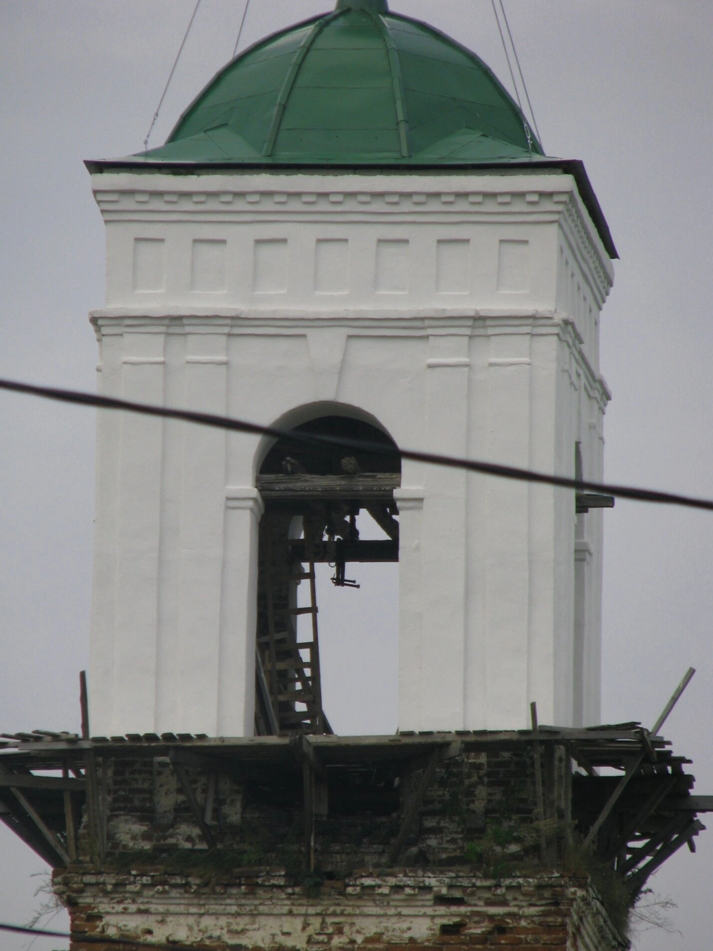 Верхний ярус колокольни имеет квадратное основание и оштукатурен в традиционный белый цвет. Арочный проём позволяет увидеть внутренние деревянные конструкции, напоминая о таинствах, совершавшихся под сенью этого святого места. Нижняя часть сооружения, сложенная из кирпича, находится в процессе реставрации, о чём свидетельствуют установленные строительные леса и участки, требующие восстановления.