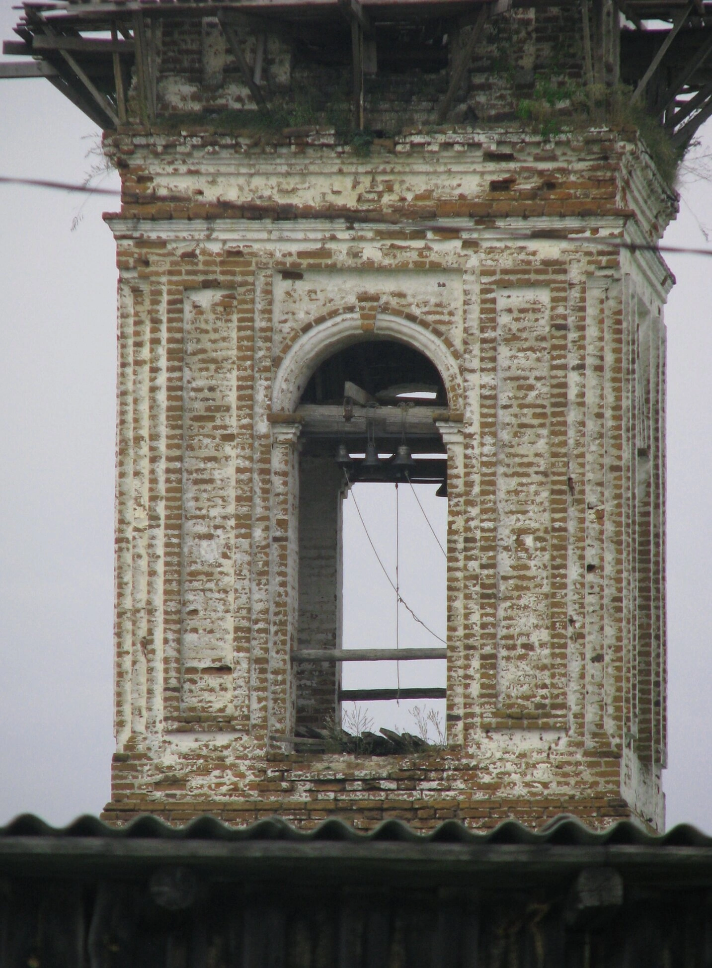 На представленной фотографии запечатлена печальная картина разрушения – верхний ярус колокольни храма во имя Святителя и Чудотворца Николая, что в селе Мугрево-Никольское Ивановской области. Монументальное сооружение из красного кирпича, некогда возносившее к небу свои звоны, ныне пребывает в запустении и руинах.