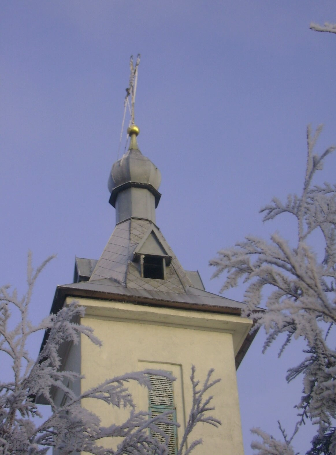На представленной фотографии запечатлена колокольня Церкви Святого Духа, расположенной в городе Нестерове Калининградской области. Это православное сооружение, являющееся важным духовным центром региона, демонстрирует традиционные элементы церковного зодчества.