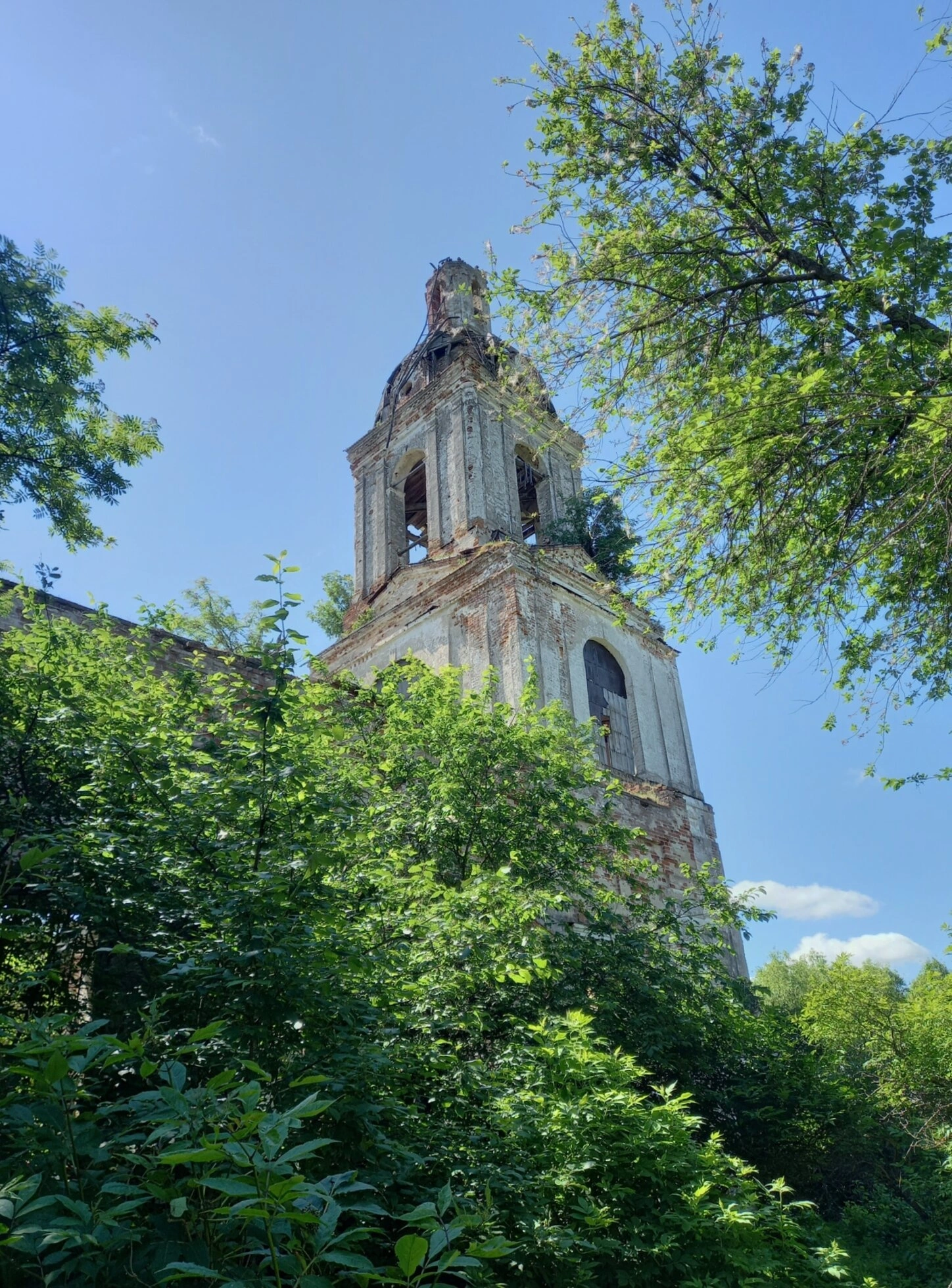 На представленной фотографии запечатлена колокольня некогда величественной Церкви Святого Духа, расположенной в селе Богородское Мышкинского района Ярославской области. Каменный храм был возведён в 1828 году на средства прихожан и являлся духовным центром для жителей окрестных деревень.