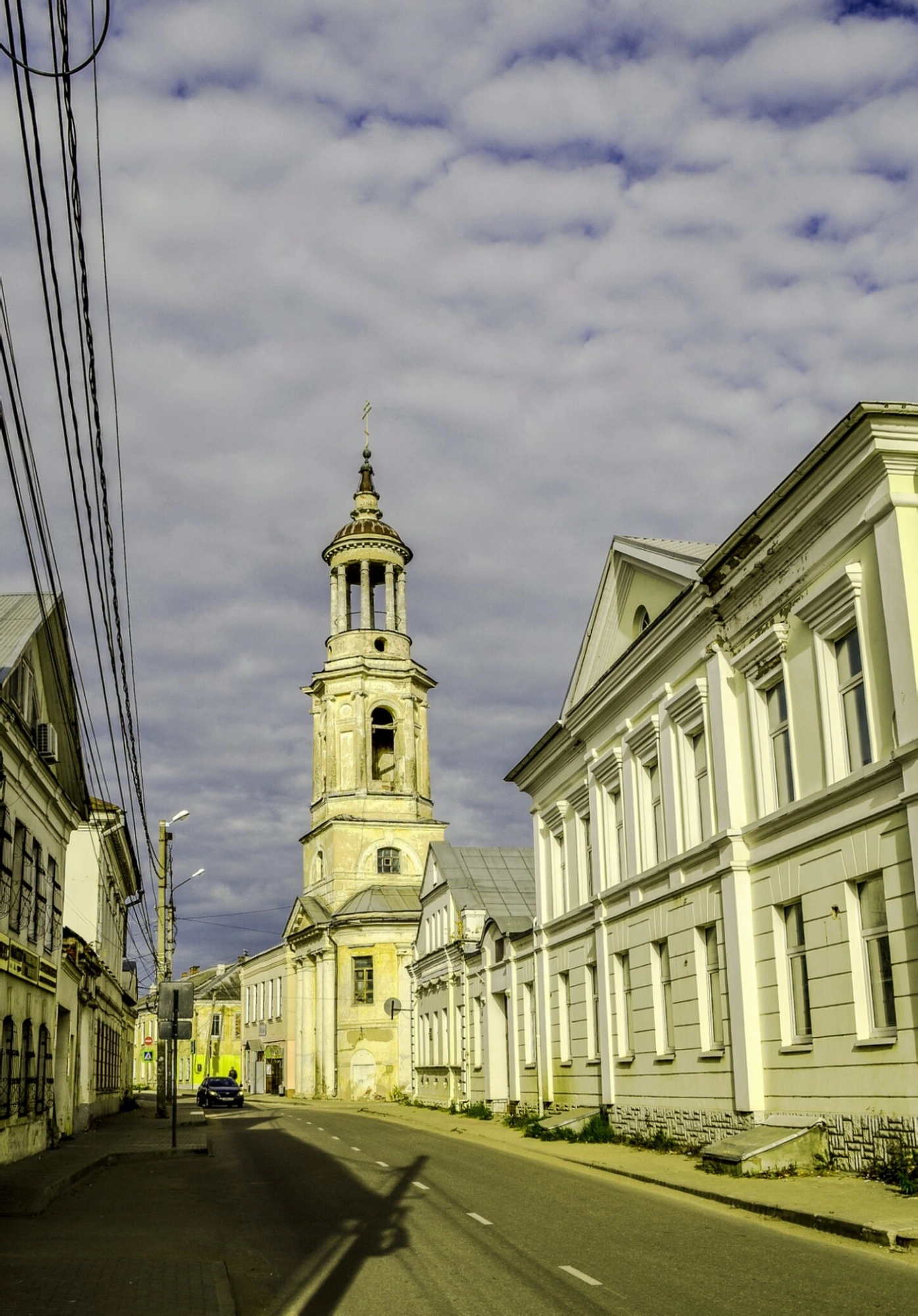 На фотографии запечатлён живописный вид улицы Луначарского в старинном городе Торжке Тверской области. Центральным архитектурным элементом композиции является величественная колокольня Церкви во имя Святого и Славного Первомученика Клемента, Папы Римского. Многоярусное сооружение, увенчанное шпилем с крестом, гордо возносится в небеса, доминируя над окружающей исторической застройкой.