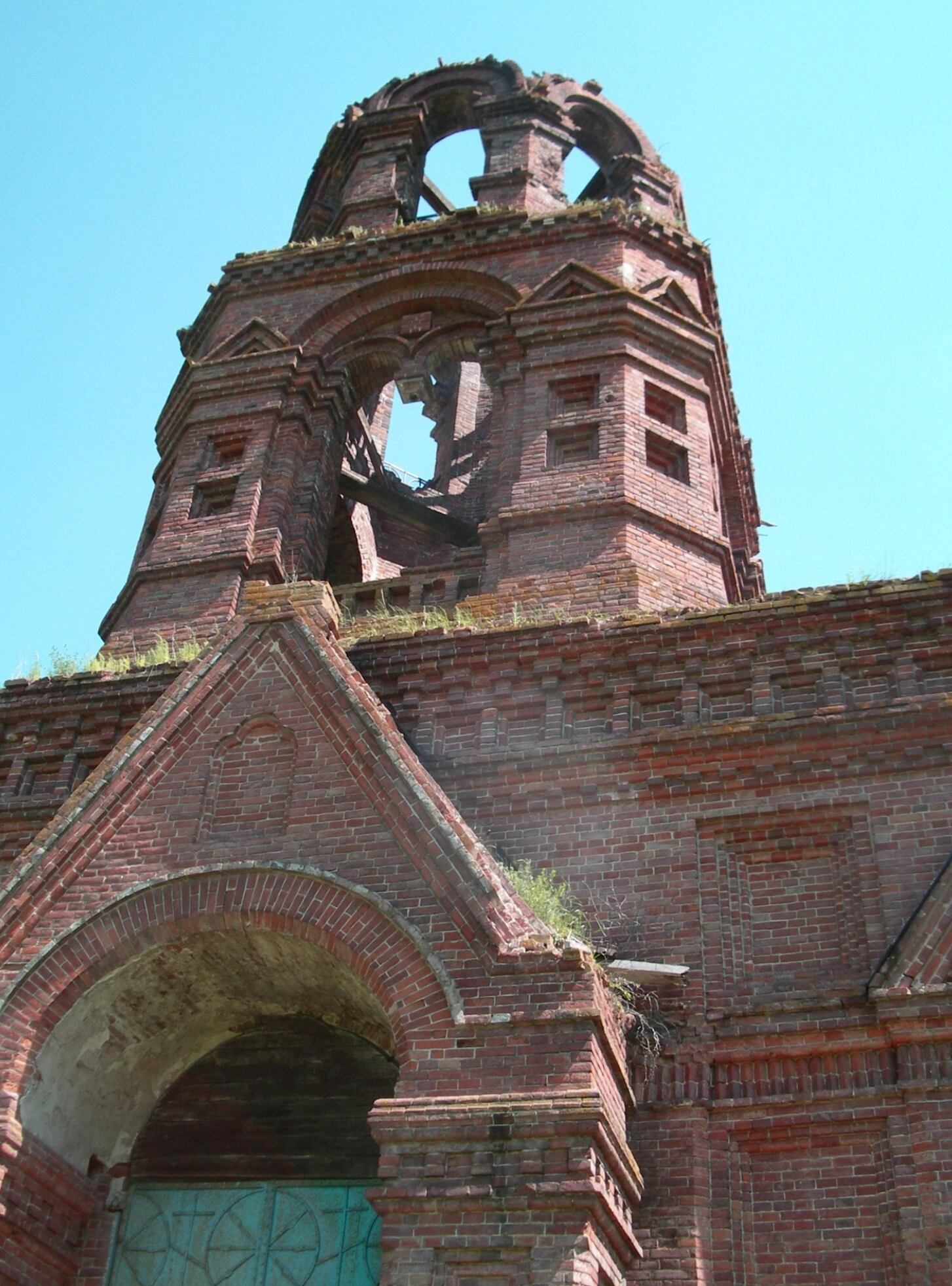 Верхний ярус колокольни и шатровое завершение практически полностью утрачены, что придаёт сооружению скорбный вид. Однако взгляд неизменно притягивают изящные арочные проёмы звона и сохранившиеся декоративные элементы — кирпичные узоры и карнизы, говорящие о высоком мастерстве строителей. Ракурс съёмки снизу вверх подчёркивает исполинские размеры колокольни и позволяет ощутить её устремлённость к небесам, символизирующую молитву.