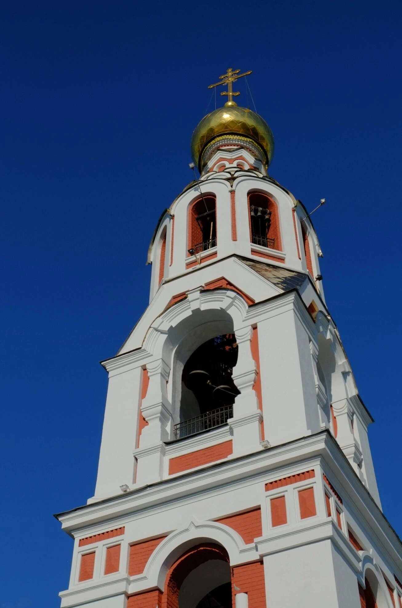 Венчает колокольня золоченый купол, увенчанный православным восьмиконечным крестом, который символизирует искупительную жертву Спасителя. В верхнем ярусе колокольни расположены арочные проемы звона, через которые виднеются церковные колокола, предназначенные для созыва верующих на богослужение и возвещения важнейших моментов литургии.