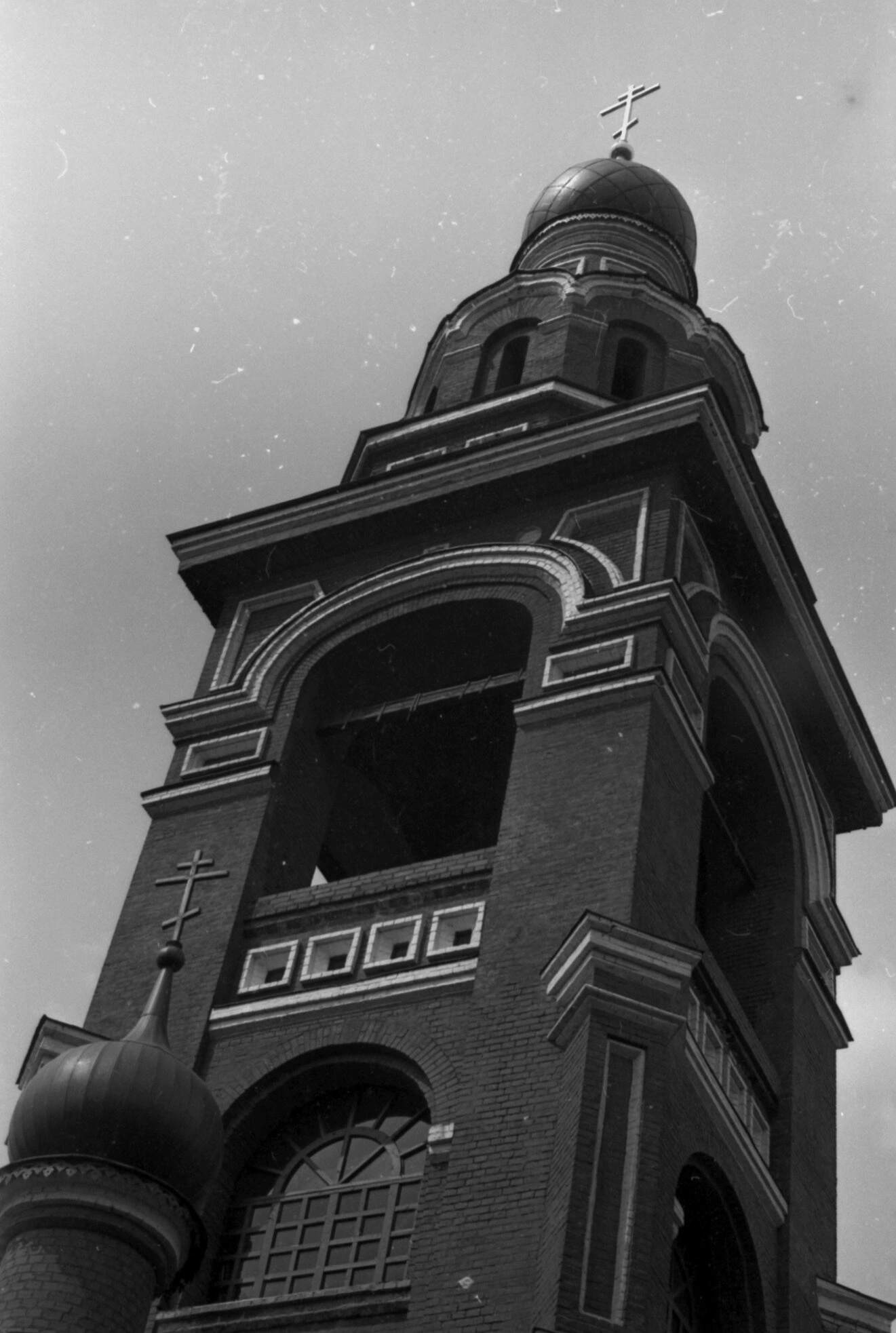На представленной чёрно-белой фотографии запечатлена колокольня Церкви Троицы Живоначальной, расположенной в городе Электроугли Московской области. Снимок выполнен в историческом черно-белом формате, что придаёт ему особую документальную ценность и подчёркивает архитектурное величие православной святыни.
