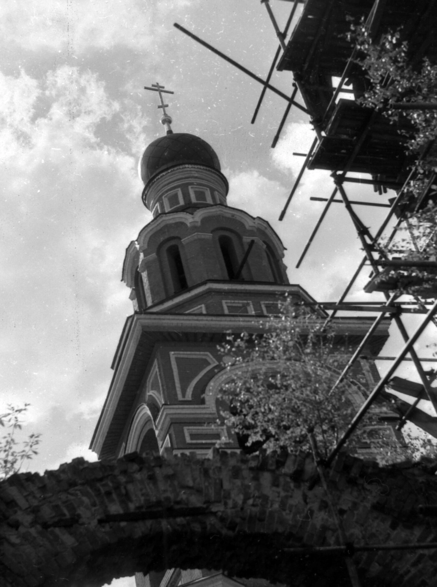 Колокольня, возведённая в начале XX века, представляет собой значительный памятник церковной архитектуры. На фотографии хорошо просматривается купол с установленным на нём православным крестом, который возносится к небу как символ веры и надежды. Несмотря на временные конструкции, предназначенные для восстановительных работ, величие церковного строения остаётся неизменным.