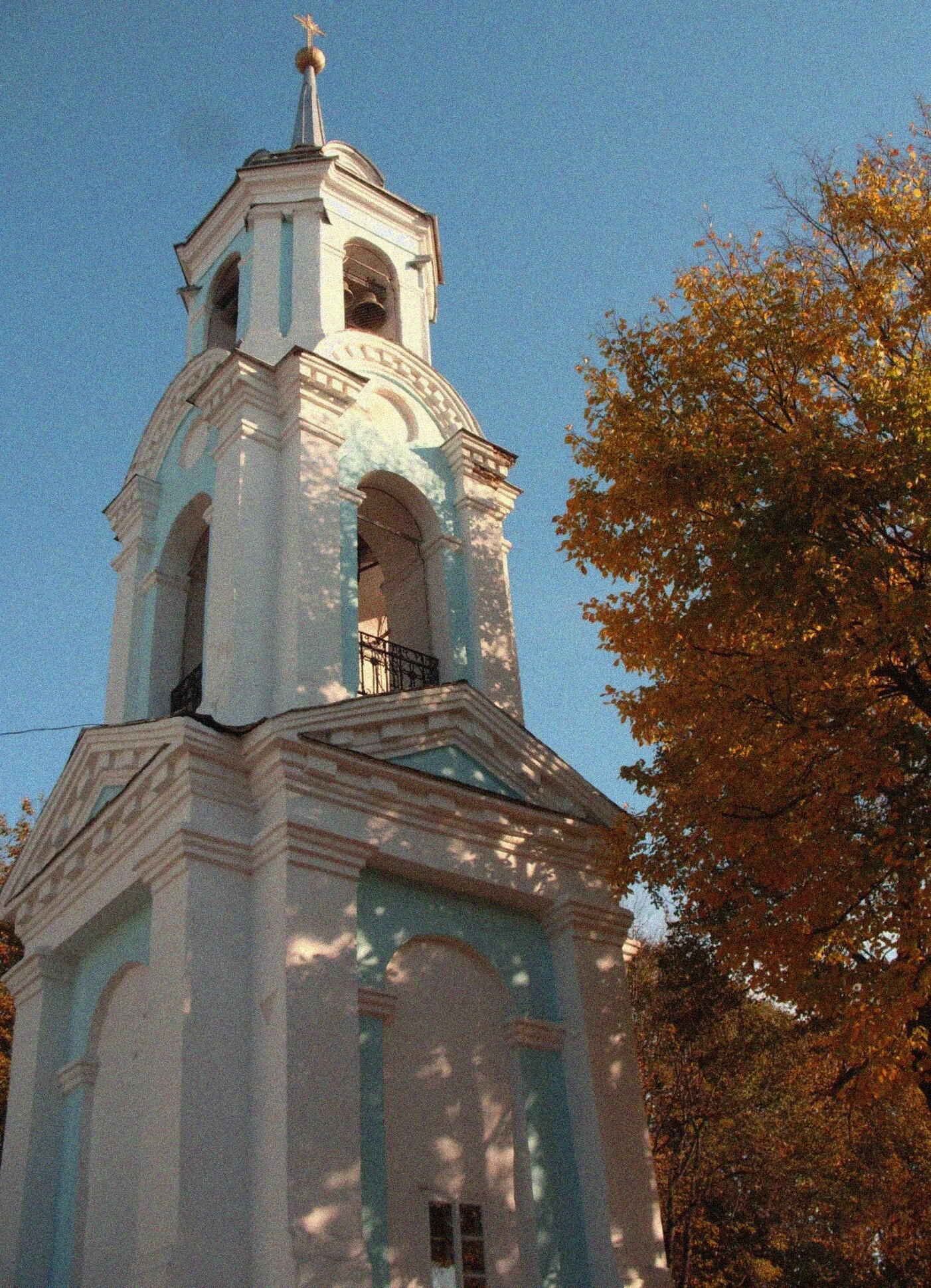 В арочных проёмах ярусов звоницы видны церковные колокола, предназначенные для созыва верующих на богослужение и возвещения важнейших моментов литургии. Венчает колокольню золочёная главка с водружённым на неё крестом – символом спасения и искупительной жертвы Христовой. Осенняя природа, запечатлённая на снимке, добавляет образу особого лирического звучания: ярко-жёлтая листва дерева у храма свидетельствует о прекрасной поры бабьего лета.