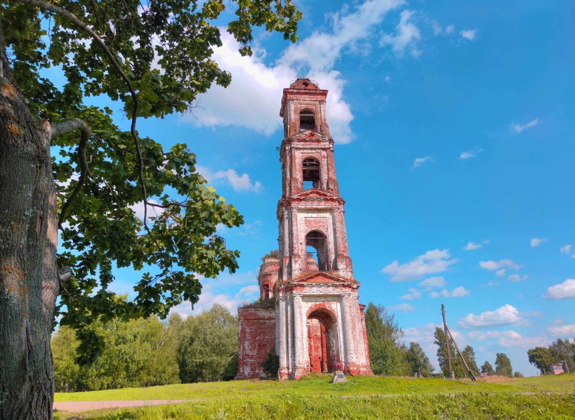 На представленной фотографии запечатлена колокольня некогда величественного храма в честь Смоленской иконы Божией Матери, что располагается в селе Армёнки Нерехтского района Костромской области. Многоярусное кирпичное сооружение, возведённое в традициях русского церковного зодчества, ныне пребывает в полуразрушенном состоянии, являясь безмолвным свидетелем былого благолепия и духовной жизни этих мест.