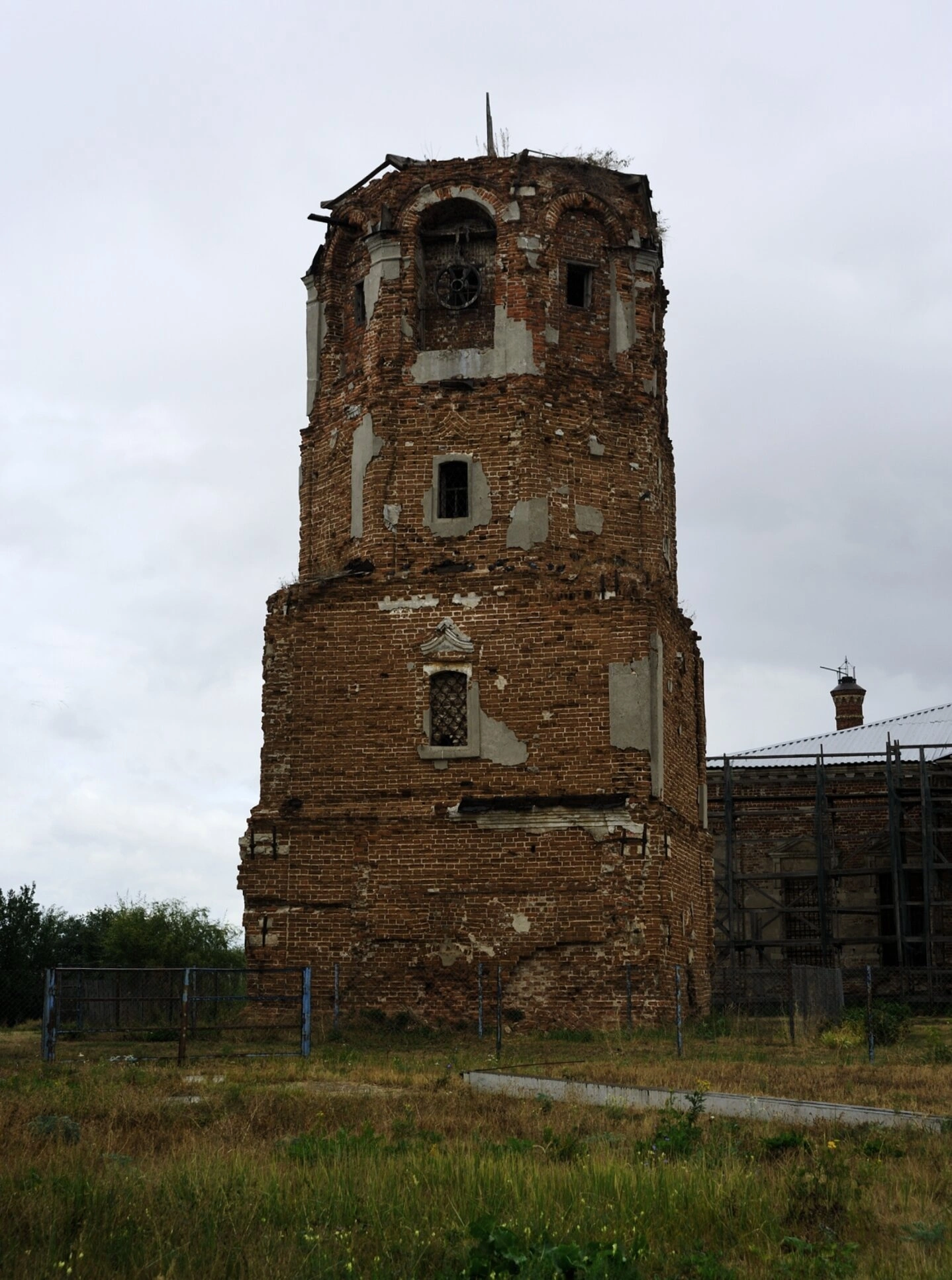 Круглая в сечении башня, сложенная из красного кирпича, демонстрирует характерные для православной архитектуры элементы: арочные и прямоугольные оконные проёмы, некогда предназначенные для освещения внутреннего пространства и распространения колокольного звона, а также следы декоративных ниш, украшавших фасад. Верхняя часть колокольни, где традиционно располагалась звонница с колоколами, ныне утрачена, что лишает сооружение его сакральной функции и архитектурной завершённости.