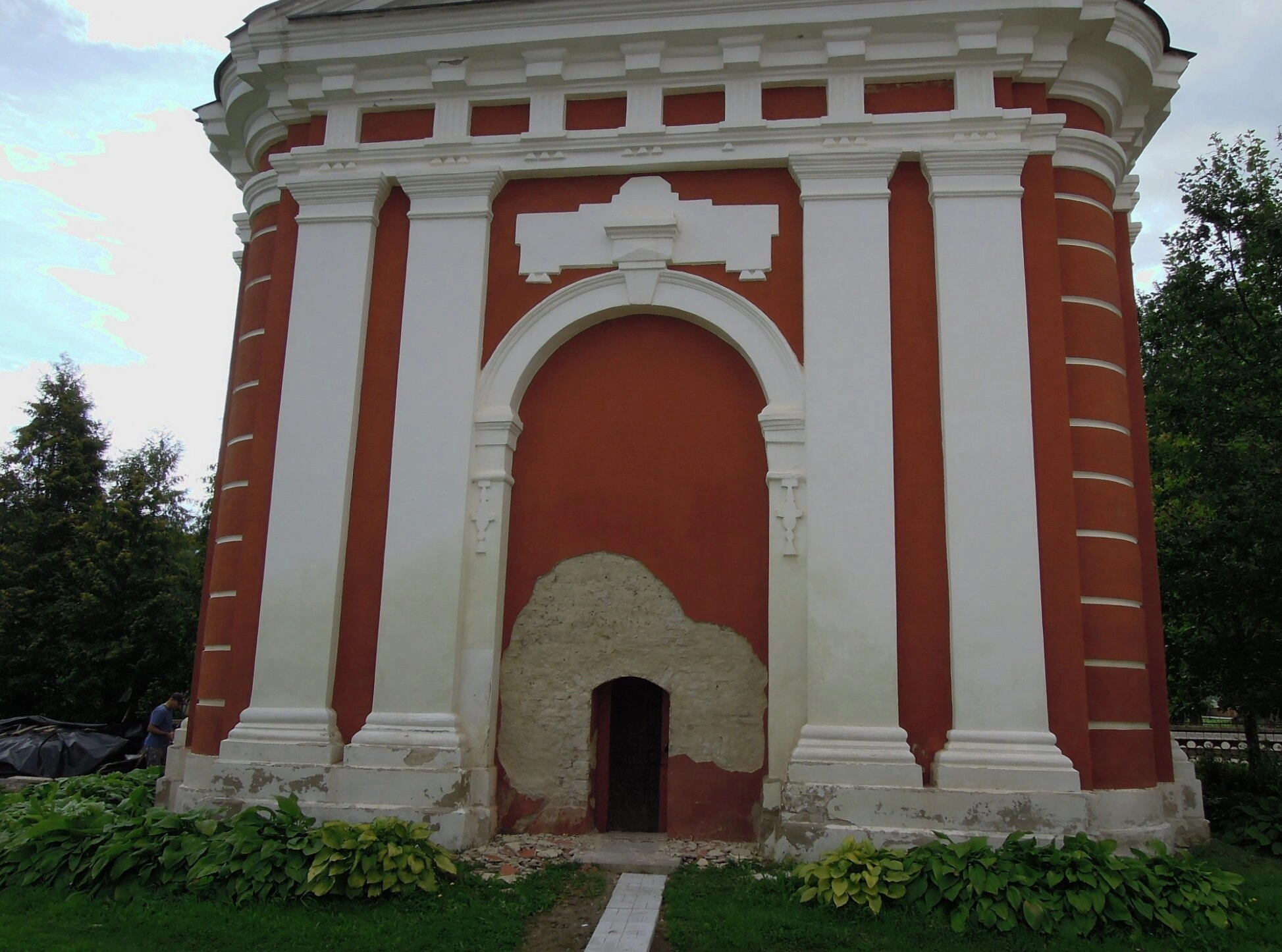 На представленной фотографии запечатлён фрагмент архитектурного ансамбля Воскресенского собора города Старая Русса — монументальный вход на колокольню храма. Каменная церковь Воскресения Христова, возведённая в конце XVII века на слиянии рек Полисти и Порусьи, является одним из знаковых православных сооружений Новгородской земли и архитектурной доминантой исторического центра города.