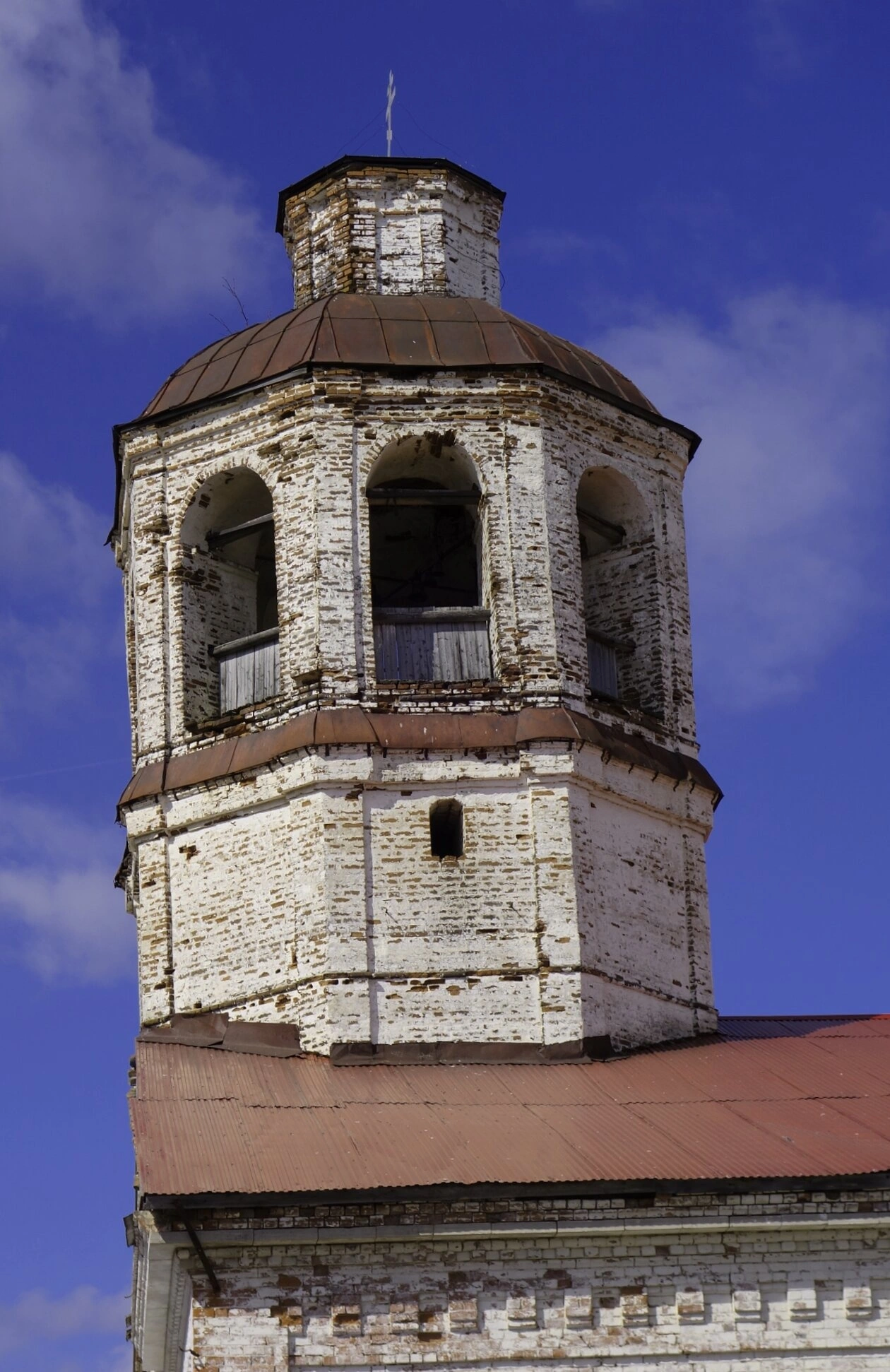 На представленной фотографии запечатлена колокольня Церкви Воздвижения Крества Господня, расположенной в селе Верх-Боровское Пермского края. Снимок детально передаёт архитектурные особенности верхней части колокольни, выполненной из красного кирпича, который за долгие годы подвергся естественному выцветанию и местами облупился, обнажив более светлые слои кладки.