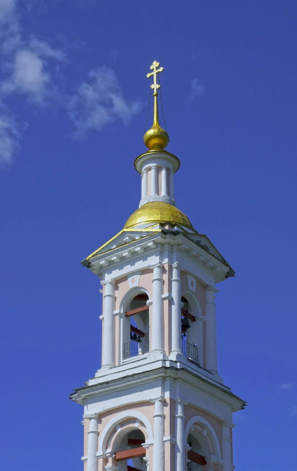 Верхний ярус колокольни увенчан золочёной главой луковичной формы, над которой возносится остроконечный шпиль с установленным православным крестом, символизирующим спасение и искупление. Несколько ярусов звонницы выполнены из кирпича и оштукатурены, а светлый фасад с лёгким розоватым оттенком украшен деталями из белого камня. В арочных проёмах верхнего яруса, поддерживаемых изящными колоннами, размещаются церковные колокола, благовест которых разносится над округой.