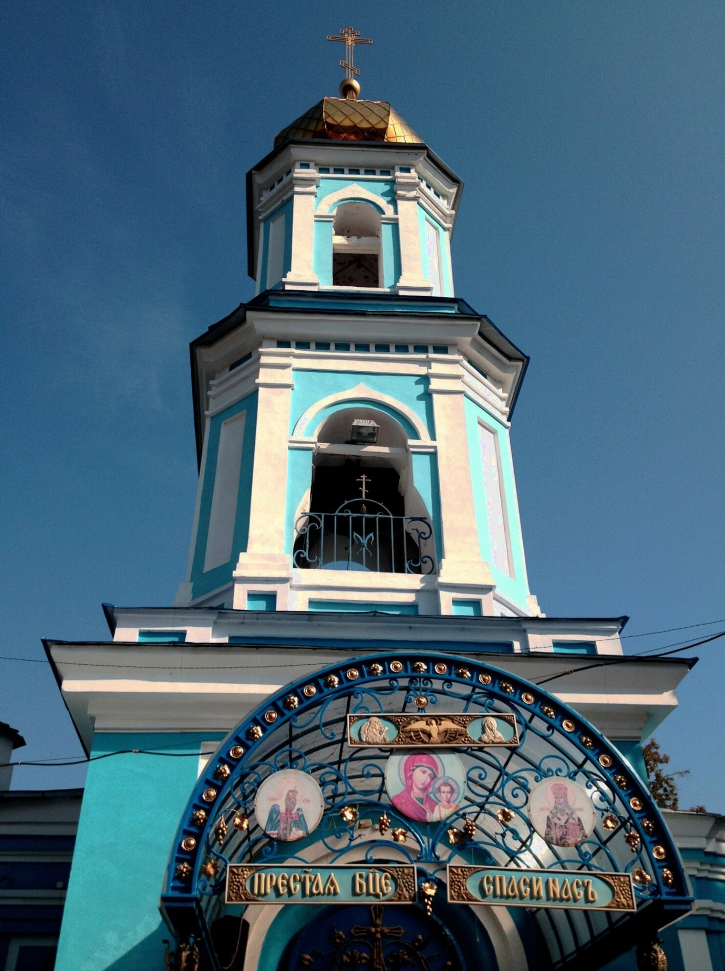 На представленной фотографии запечатлена колокольня Церкви Ярославских Чудотворцев, расположенной на территории исторического Арского кладбища в Казани. Снимок выполнен с нижнего ракурса, что позволяет в полной мере оценить величие и стройность архитектурного сооружения, устремленного в небесную высь.