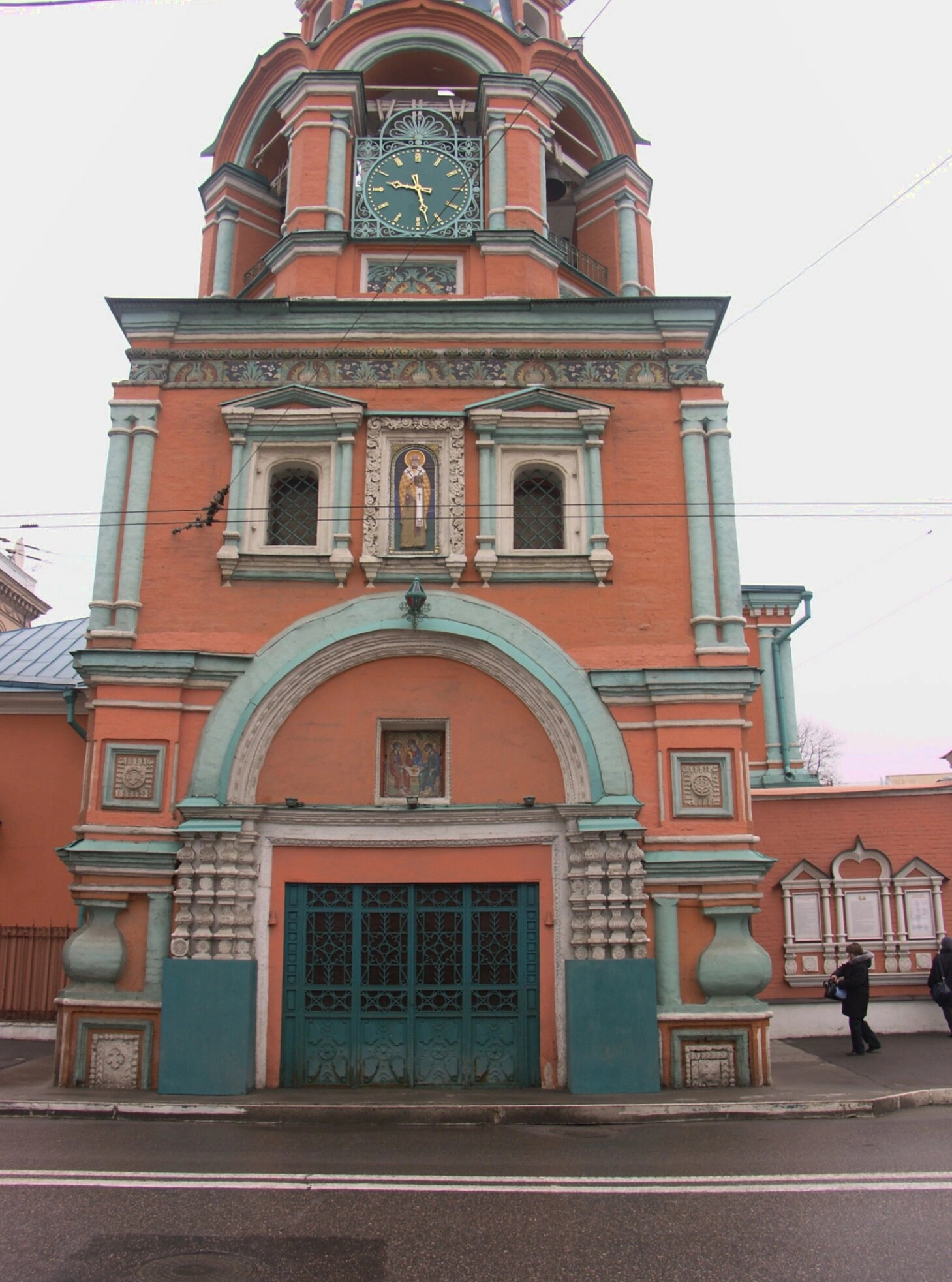 Колокольня, служащая западным входом в церковь, представляет собой величественное восьмигранное сооружение, увенчанное каменным шатром. Её фасад, как и весь храмовый комплекс, выполнен из красного кирпича и богато украшен. Особую нарядность и узнаваемость придают зданию многочисленные декоративные элементы, окрашенные в белый и бирюзовый цвета. Ярус звона украшен резными наличниками с килевидными завершениями, а в проёмах установлены зелёные часовые циферблаты с римскими цифрами. Венчает колокольню небольшая главка с позолоченным крестом, увенчанным царской короной, что подчёркивает придворный статус, который имел этот храм.