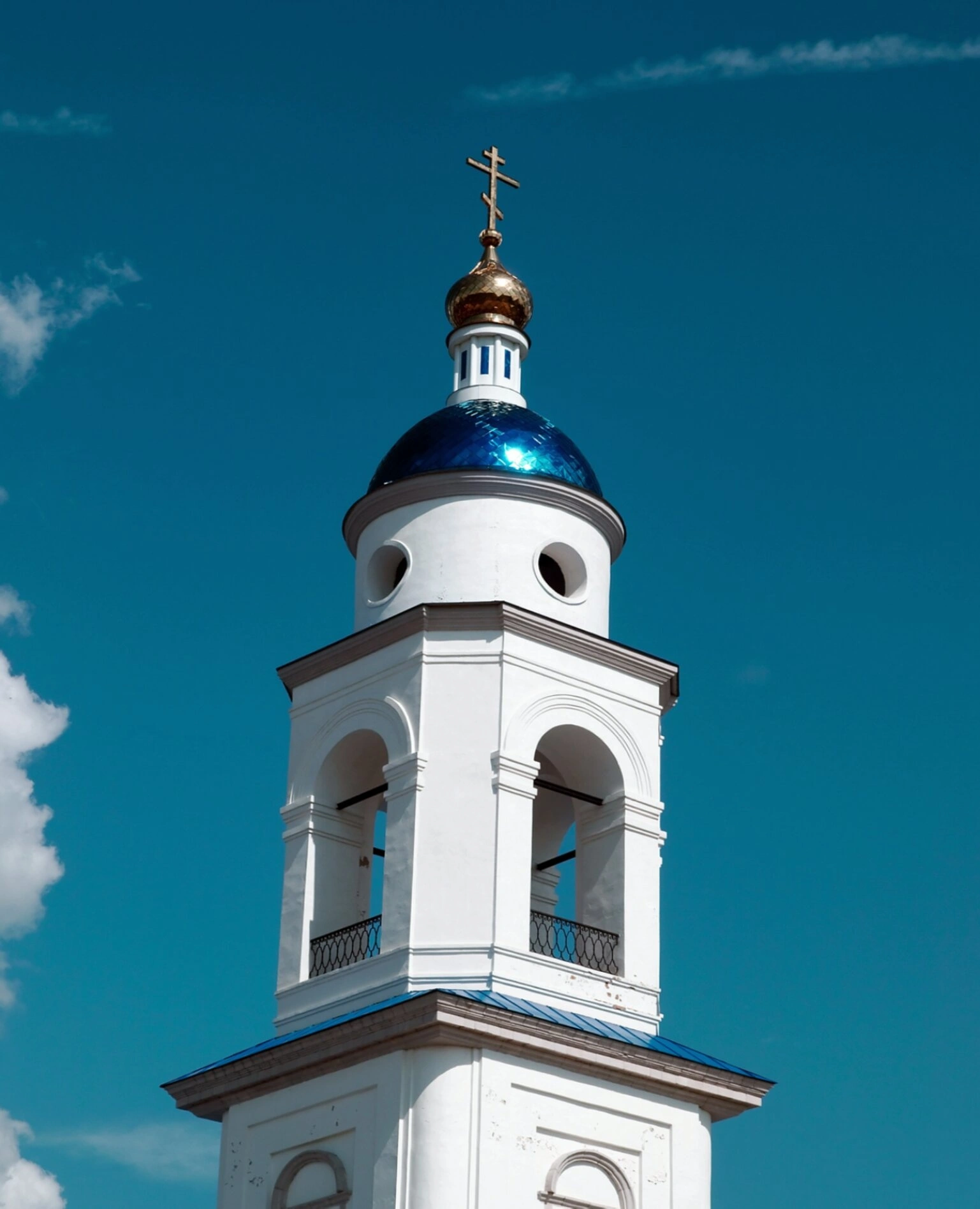 Венчает колокольню величественный синий купол, цвет которого глубоко символичен в православной традиции и означает небесную чистоту и Пресвятую Деву Марию. Купол увенчан золочёным православным крестом, сияющим в лучах солнца как символ победы жизни над смертью и напоминание об искупительной жертве Спасителя. Лазурное небо с лёгкими облаками служит идеальным фоном, подчёркивая величие и красоту этого сакрального сооружения.