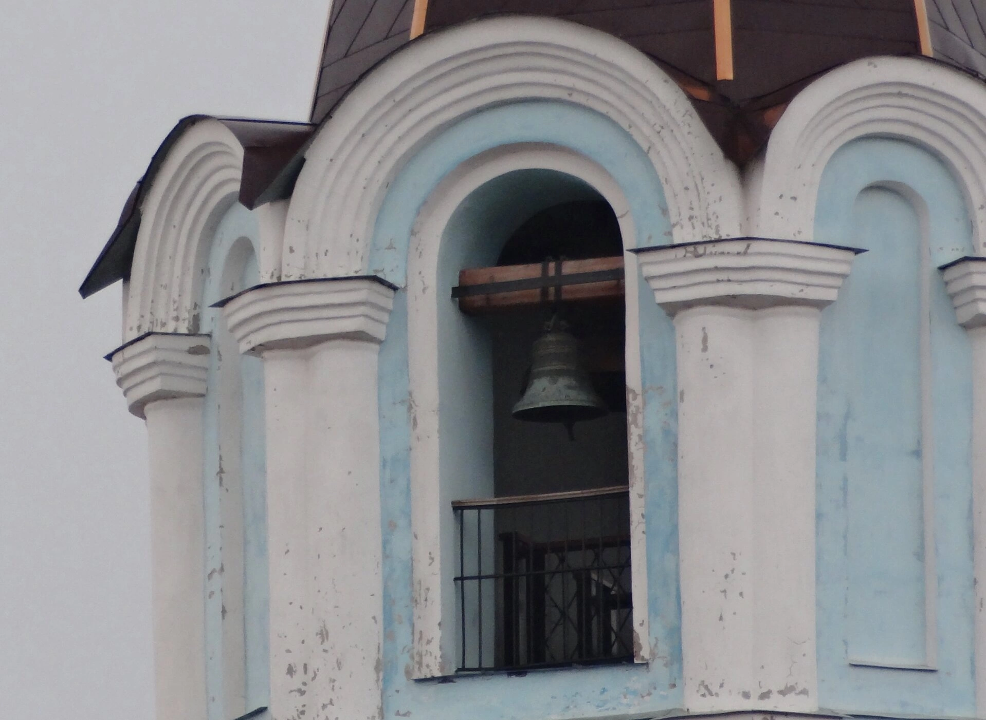 Фотография позволяет рассмотреть детали сооружения: форму и отделку ярусов, арочные проёмы звона и сам колокол, являющийся голосом православной общины города.
