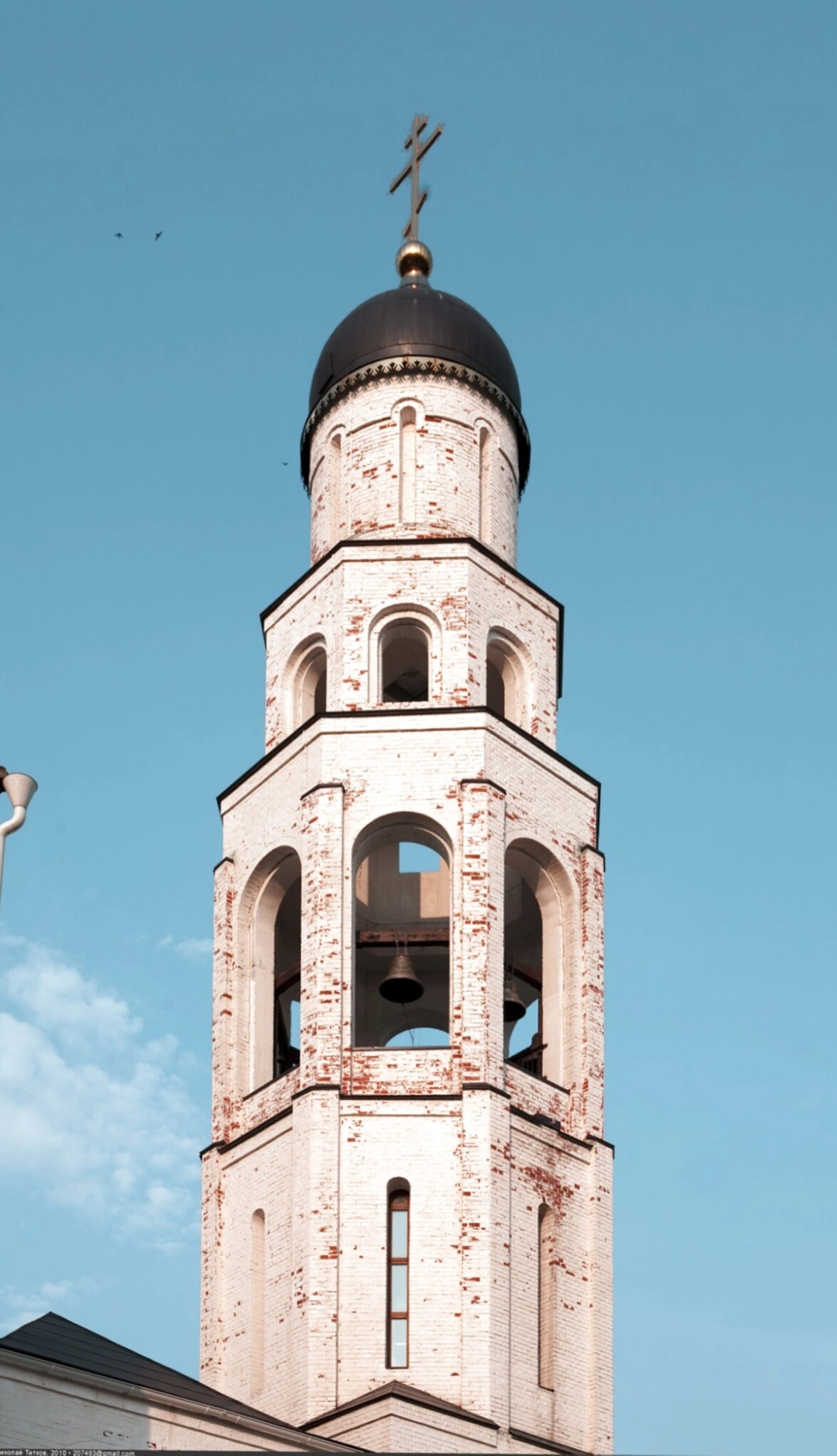 Фотография позволяет оценить не только архитектурные особенности колокольни, но и её значение как неотъемлемой части силуэта города, устремлённой в небо и напоминающей о вечных ценностях.