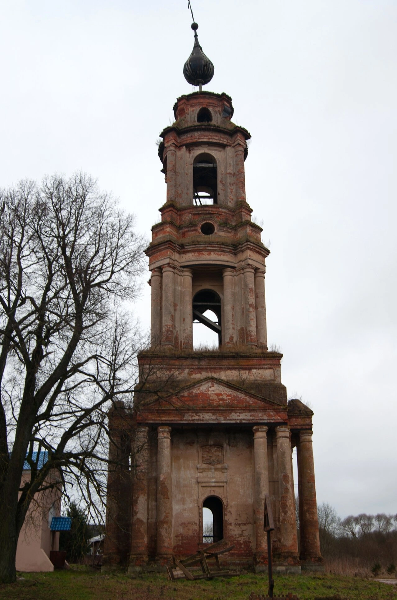 Колокольня обладает строгой и величественной архитектурой, характерной для русской церковной традиции. Нижний ярус представляет собой массивное основание с арочными проёмами, которые, вероятно, служили входом. Второй и третий ярусы выполнены в виде открытых звонниц с арочными проёмами, поддерживаемыми классическими колоннами, что позволяло звуку колоколов свободно распространяться по округе. Завершает сооружение купол с традиционной луковичной главкой и шпилем, увенчанным православным крестом, символизирующим веру и надежду.