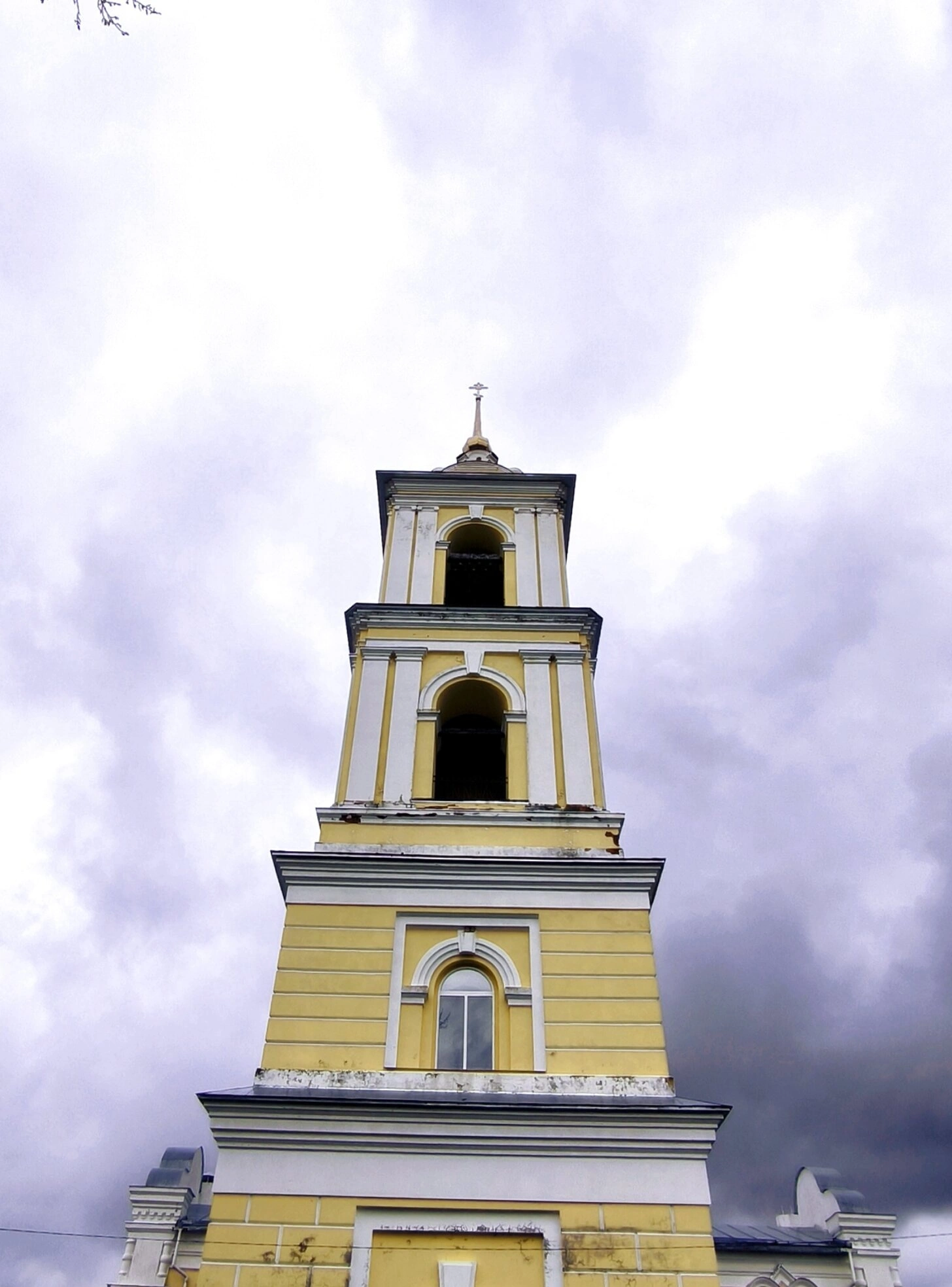 На представленной фотографии запечатлена колокольня Храма в честь Смоленской иконы Божией Матери, расположенного в историческом селе Оковцы Тверской области. Это величественное сооружение является неотъемлемой частью архитектурного ансамбля православной святыни, известной своими чудесами и глубокой духовной историей.