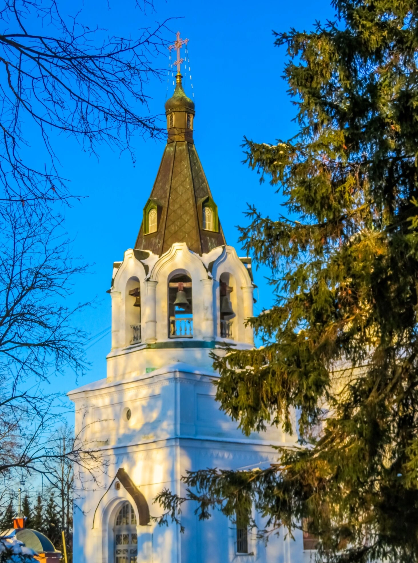 По сторонам от колокольни видны деревья, покрытые снежным убором. Справа возвышается пушистая ель, ветви которой отяжелели от снега, слева — тонкие ветви лиственных деревьев, пребывающих в зимнем покое. Яркое солнечное освещение подчёркивает благолепие архитектурных форм и создаёт выразительный контраст между белизной стен, тёмным шатром и лазурью небес.