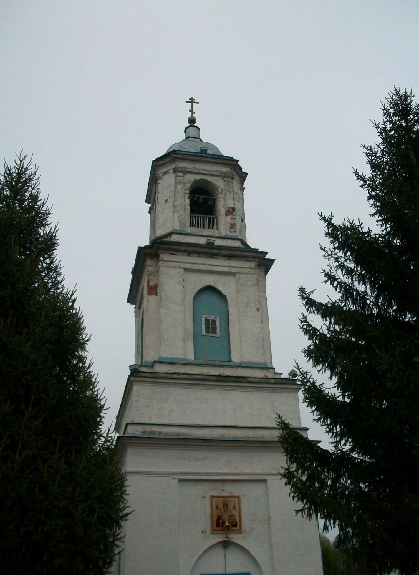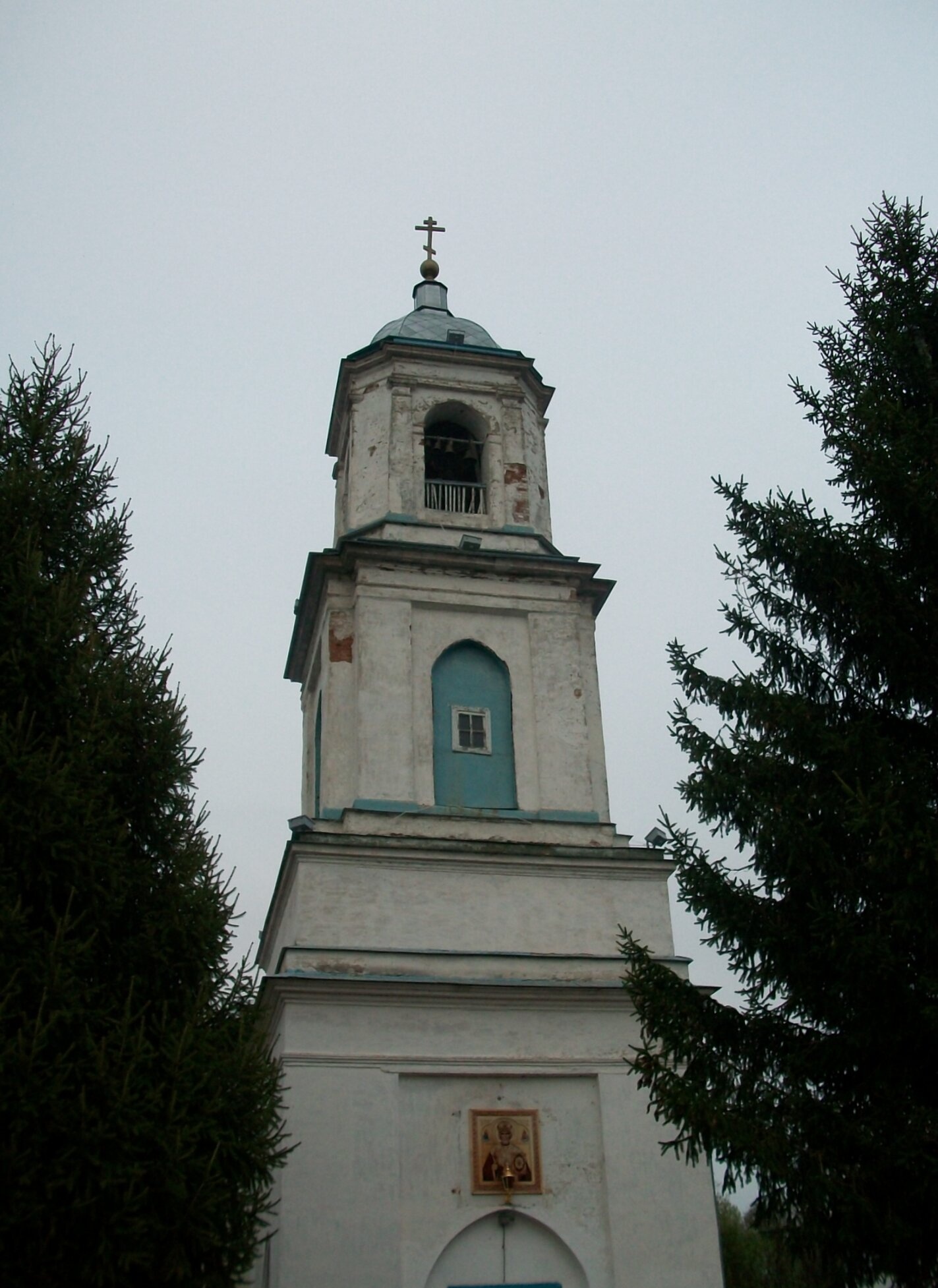 У основания колокольни, в киоте, размещена почитаемая икона, к которой с молитвой обращаются верующие. Стройную вертикаль колокольни с обеих сторон обрамляют вековые хвойные деревья, подчёркивая её устремлённость ввысь, к горнему миру. На момент съёмки над святыней простиралось пасмурное небо, добавляя изображению величия и торжественности.