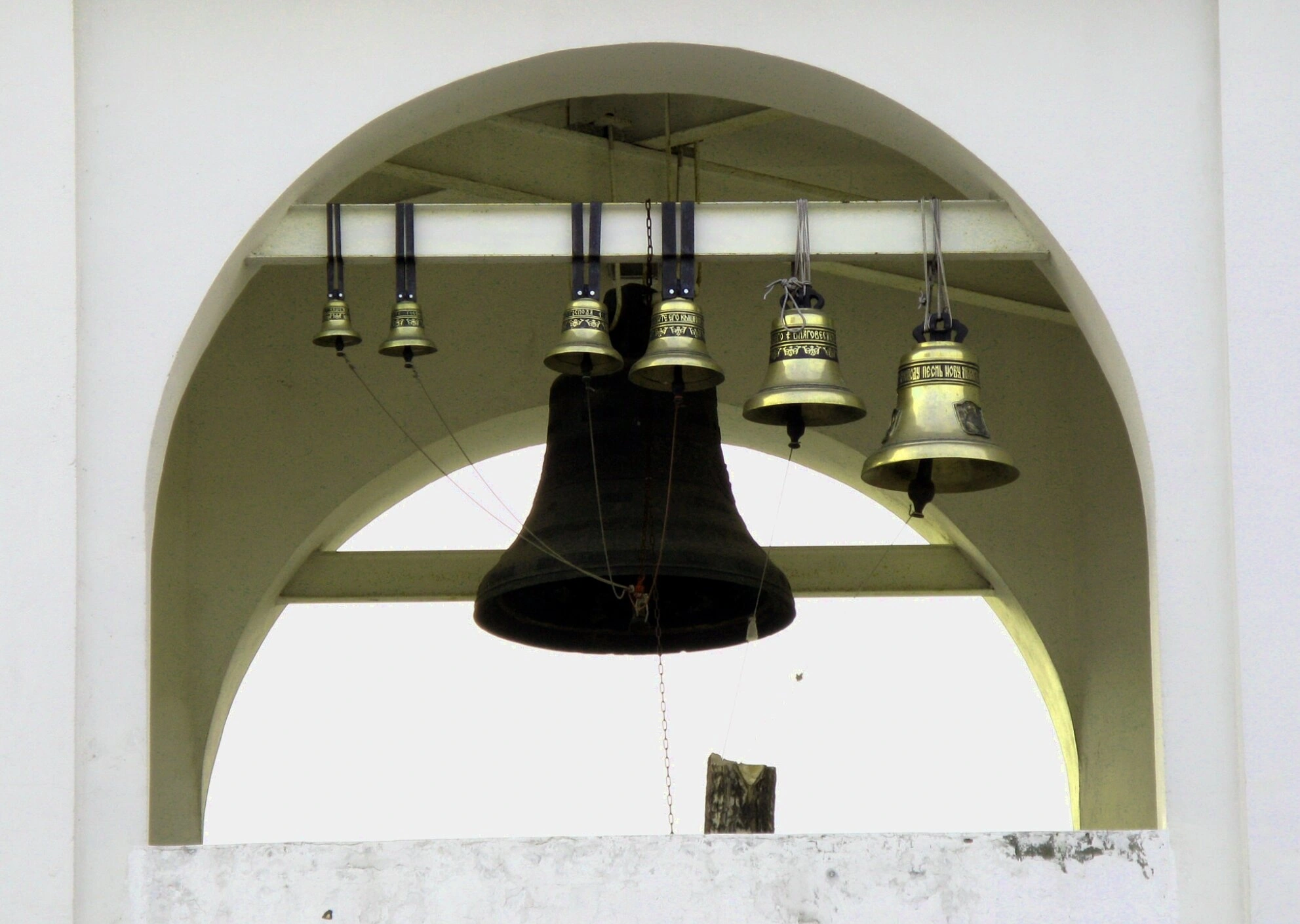 Колокола, являющиеся неотъемлемой частью православного богослужения, подвешены традиционным образом. На их поверхности чётко видны литые иконописные изображения и молитвенные надписи, выполненные на церковнославянском языке, что свидетельствует об их освящении и предназначении для созыва верующих на молитву.