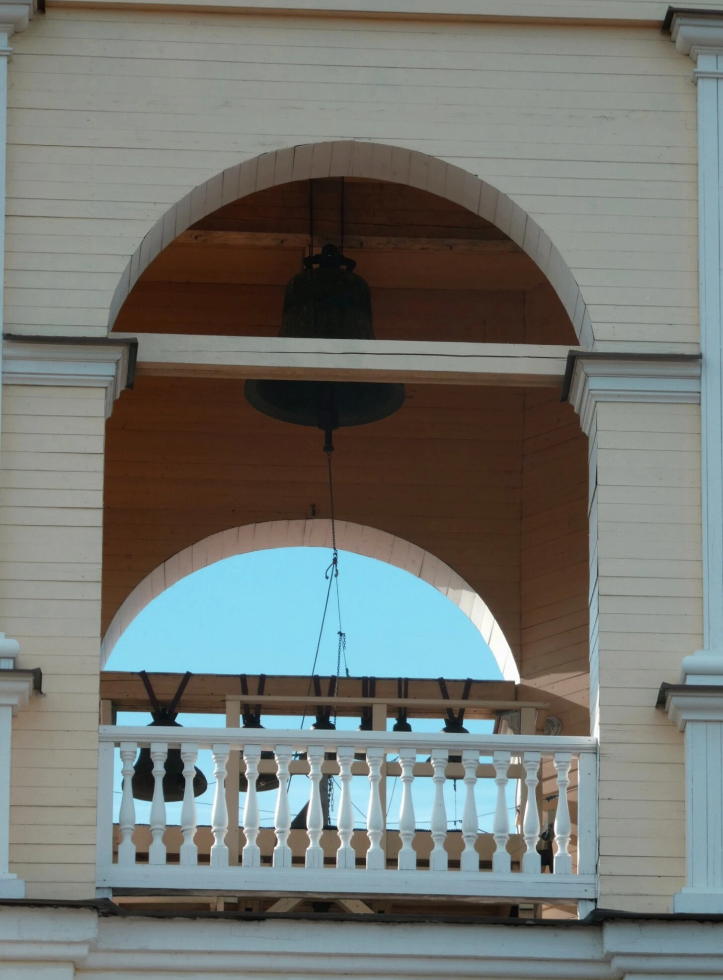 На представленной фотографии запечатлён фрагмент колокольни храма святого Андрея Критского, расположенного в посёлке Сергиево Всеволожского района Ленинградской области. Светлый фасад звонницы, выполненный из дерева или оштукатуренный, мягко освещён естественным светом, что подчёркивает её архитектурную чистоту и строгость форм.