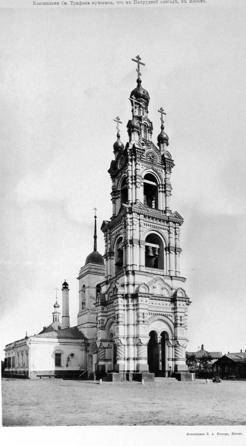 На представленной дореволюционной фотографии запечатлена колокольня храма святого мученика Трифона в Напрудном, одного из древнейших православных храмов Москвы. Святыня расположена в Мещанском районе столицы и является выдающимся памятником церковной архитектуры.