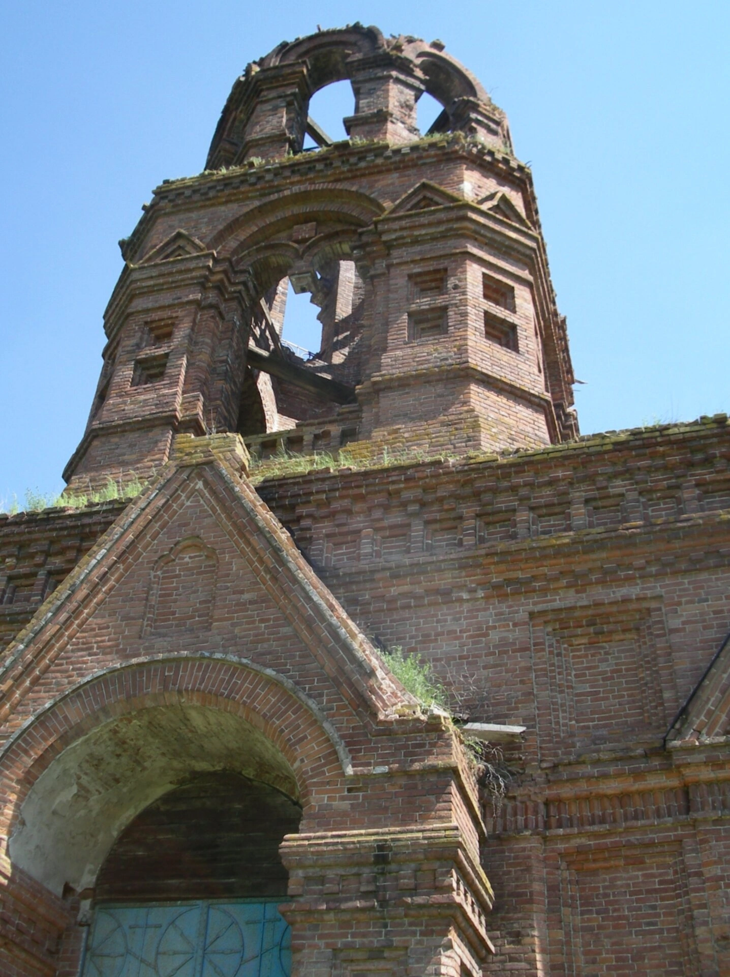 Колокольня, сложенная из красного кирпича, демонстрирует традиционные для русского храмового зодчества приёмы. Несмотря на значительные разрушения, утрату завершения и ярусов звона, в её формах угадывается былой стройный силуэт, который некогда главенствовал над окружающим пространством, созывая благовестом окрестных жителей на молитву. Глубокие провалы оконных проёмов и зияющие трещины говорят о длительном запустении.