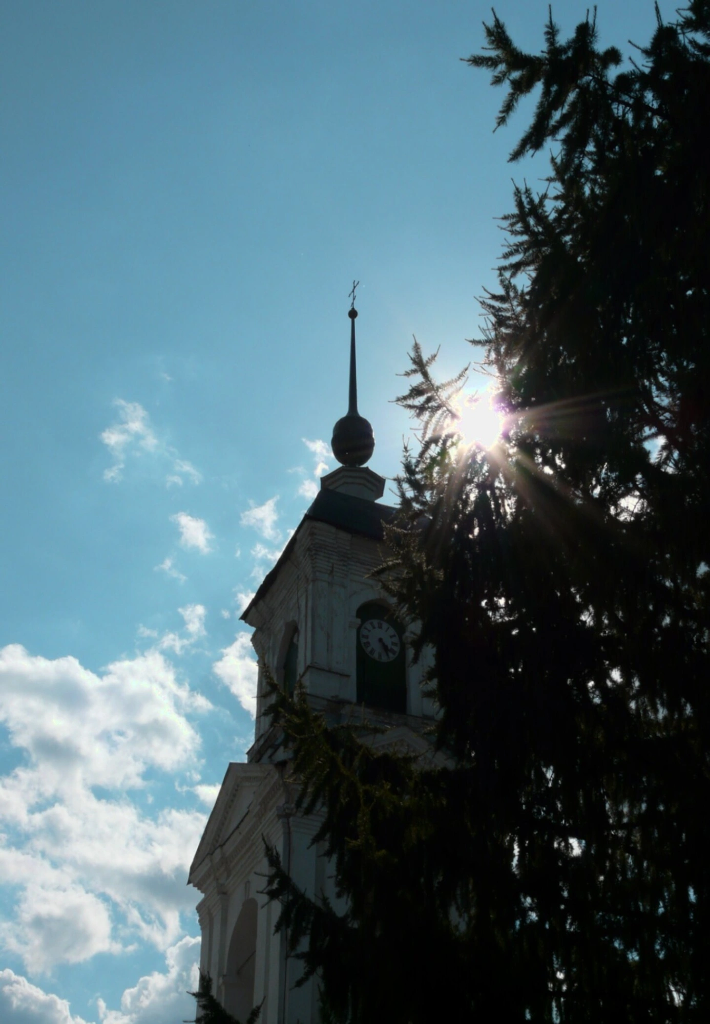 На одном из ярусов колокольни размещены церковные часы с циферблатом, которые испокон веков не только отсчитывают время земное, но и напоминают прихожанам о вечности и бренности мирской жизни. В момент съёмки лучи солнца, символизирующие Божественный свет и благодать, пробиваются сквозь ветви хвойного дерева на переднем плане, озаряя святыню и создавая возвышенную, благоговейную атмосферу.