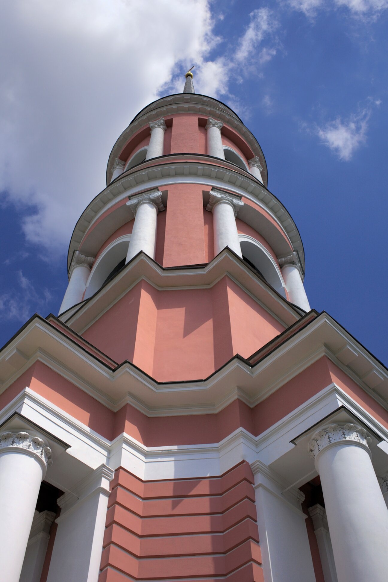 Колокольня является неотъемлемой частью храмового комплекса и ярким образцом русского классицизма. Её фасад, окрашенный в тёплый розовый цвет, гармонично сочетается с белоснежными элементами декора: стройными колоннами, изящными пилястрами и оформлением арочных проёмов ярусов звона. Каждый ярус колокольни, уменьшаясь в пропорциях, ведёт взор к небольшому куполу и изящному шпилю, увенчанному православным крестом, символизирующим победу жизни над смертью.