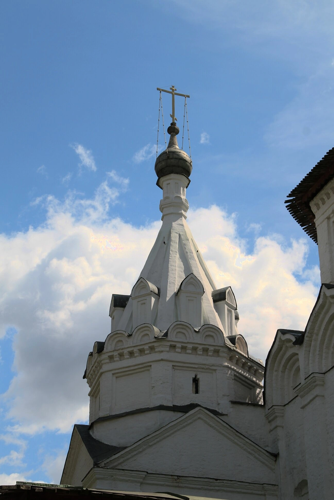 На представленной фотографии запечатлена колокольня Храма Троицы Живоначальной, расположенного в исторической местности Троицкое-Голенищеве. Снимок демонстрирует верхнюю часть шатрового завершения колокольни, увенчанную изящной главкой с православным крестом, устремлённым в небесную высь.