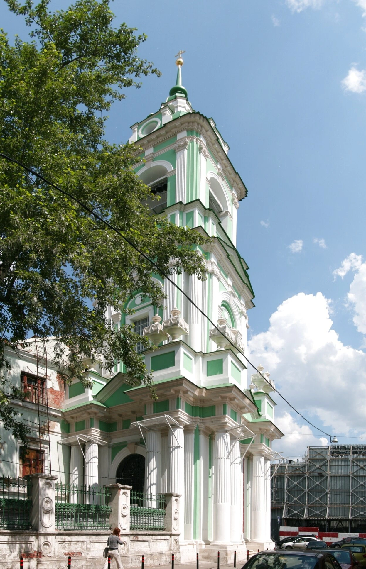 На представленной фотографии запечатлена колокольня храма Усекновения Главы Иоанна Предтечи, что под Бором, расположенного в историческом районе Москвы Замоскворечье по адресу Пятницкая улица, дом 4/2, строение 9. Святыня имеет древнюю историю, восходящую к XV веку, когда на этом месте располагался сосновый бор, от которого и произошло название "под Бором".
