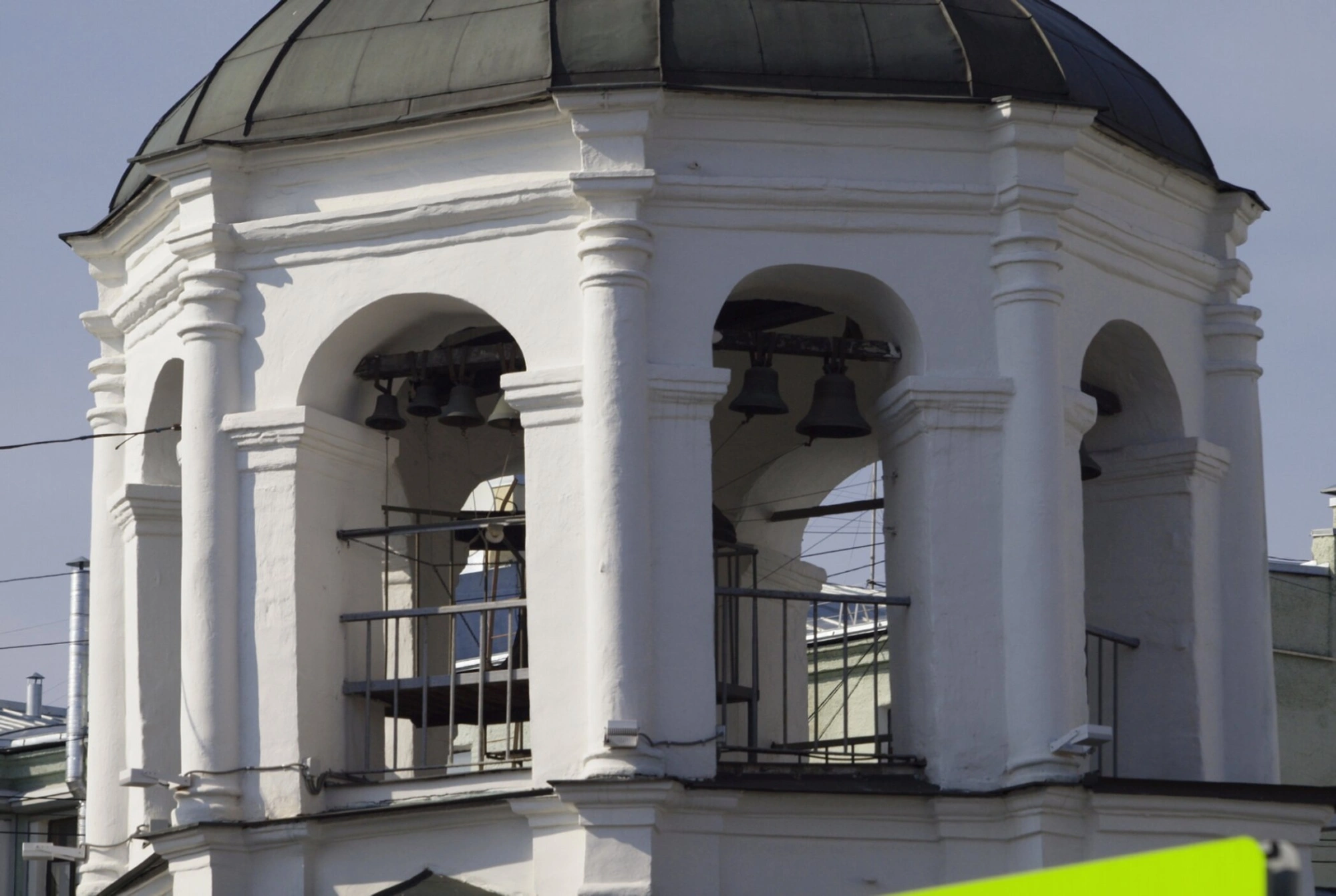 На представленной фотографии запечатлена колокольня храма Успения Пресвятой Богородицы в Печатниках. Снимок показывает верхнюю часть яруса звона, выполненную в стиле московского барокко. Колокольня, возведённая в 1695 году, состоит из двухъярусного четверика, который несёт восьмерик звона, увенчанный кирпичным шатром. Арочные проёмы, обрамлённые колоннами, вмещают колокола и металлические ограждения. Тёмный купол завершает композицию.