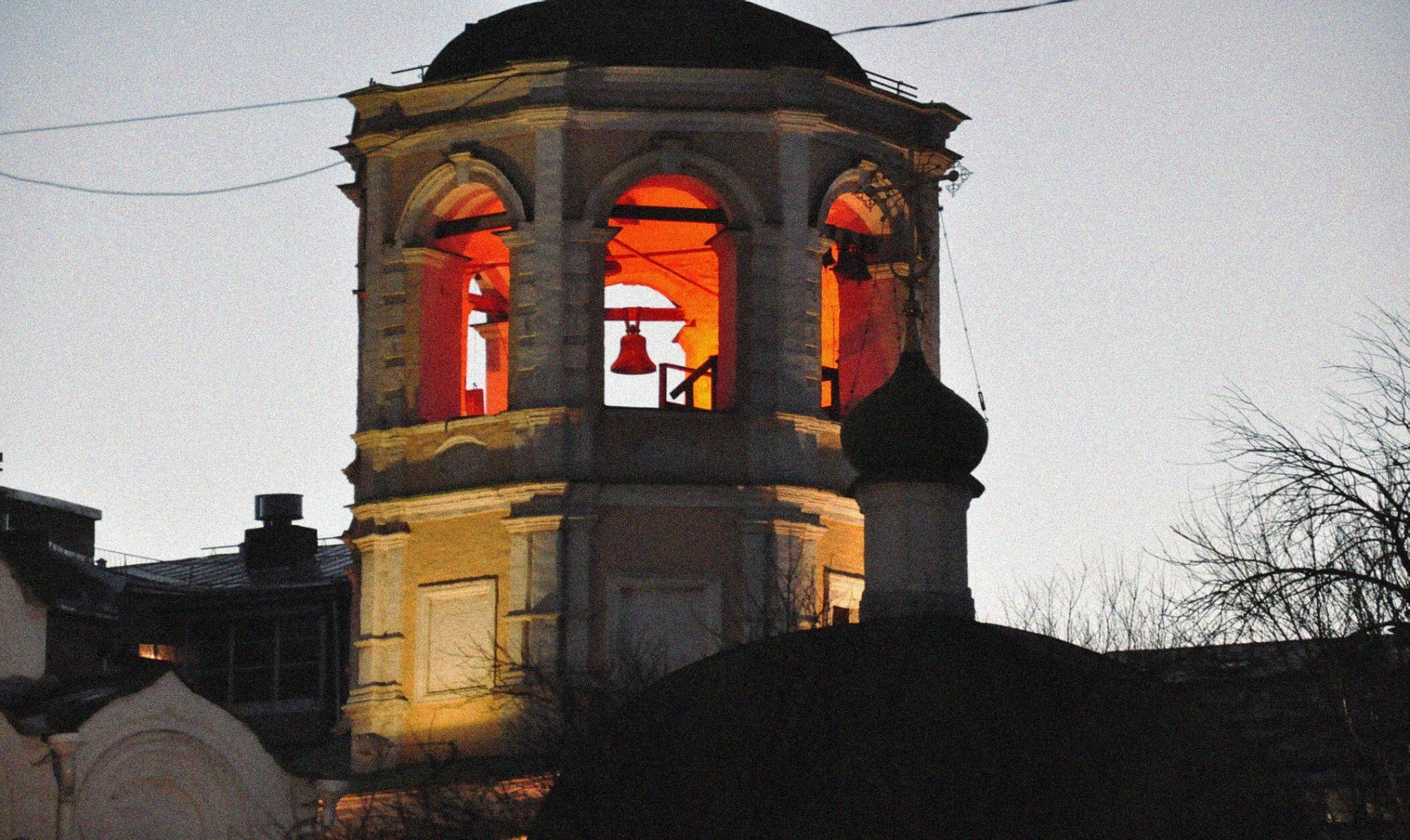 На фотографии запечатлена колокольня старинного храма Успения Пресвятой Богородицы, что в Путинках, в вечерний час. Снимок сделан в сумерках, когда тёплый свет изнутри яруса звона эффектно подсвечивает архитектурные details каменного сооружения, создавая благоговейную и умиротворённую атмосферу. Этот золотистый свет символизирует неугасимую лампаду веры, сияющую во тьме мира.
