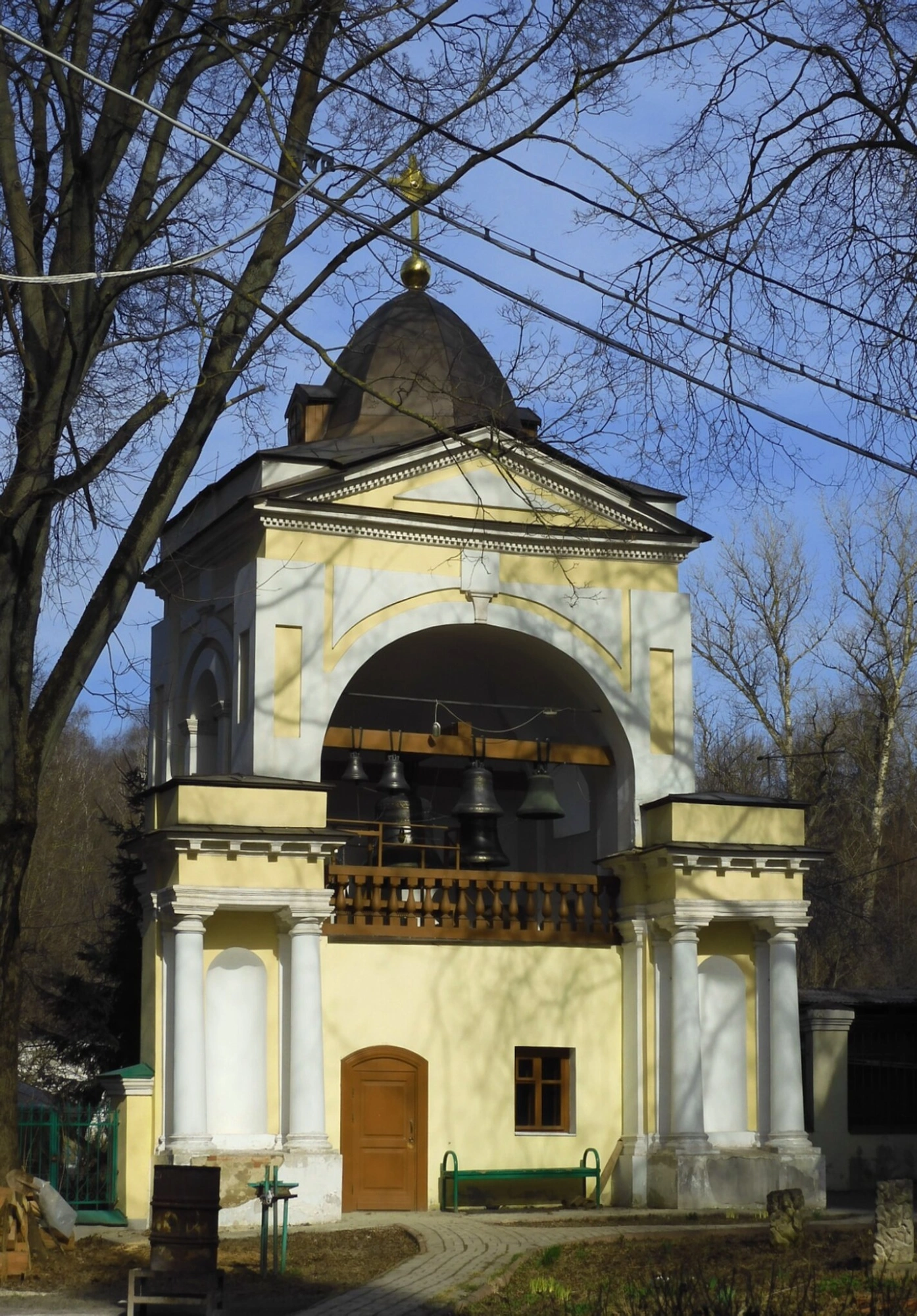 Колокольня, изображённая на снимке, гармонично вписывается в общий архитектурный замысел и является важным композиционным элементом всего храмового комплекса. За свою историю усадьба и храм пережили многие значимые события, в том числе в период Отечественной войны 1812 года, когда здесь располагались французские войска.
