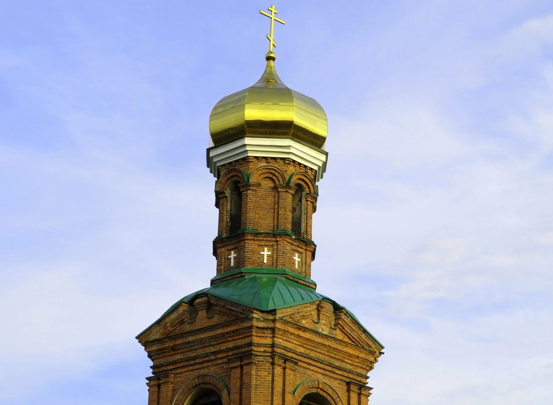 На представленной фотографии запечатлена величественная колокольня и сияющий золотой купол православного храма. Колокольня, сложенная из красного кирпича, устремляется в небо, увенчанная зелёной кровлей, на которой установлены белые кресты. Её ярусы украшены арочными проёмами, сквозь которые доносится благодатный звон колоколов, созывающий верующих на молитву.