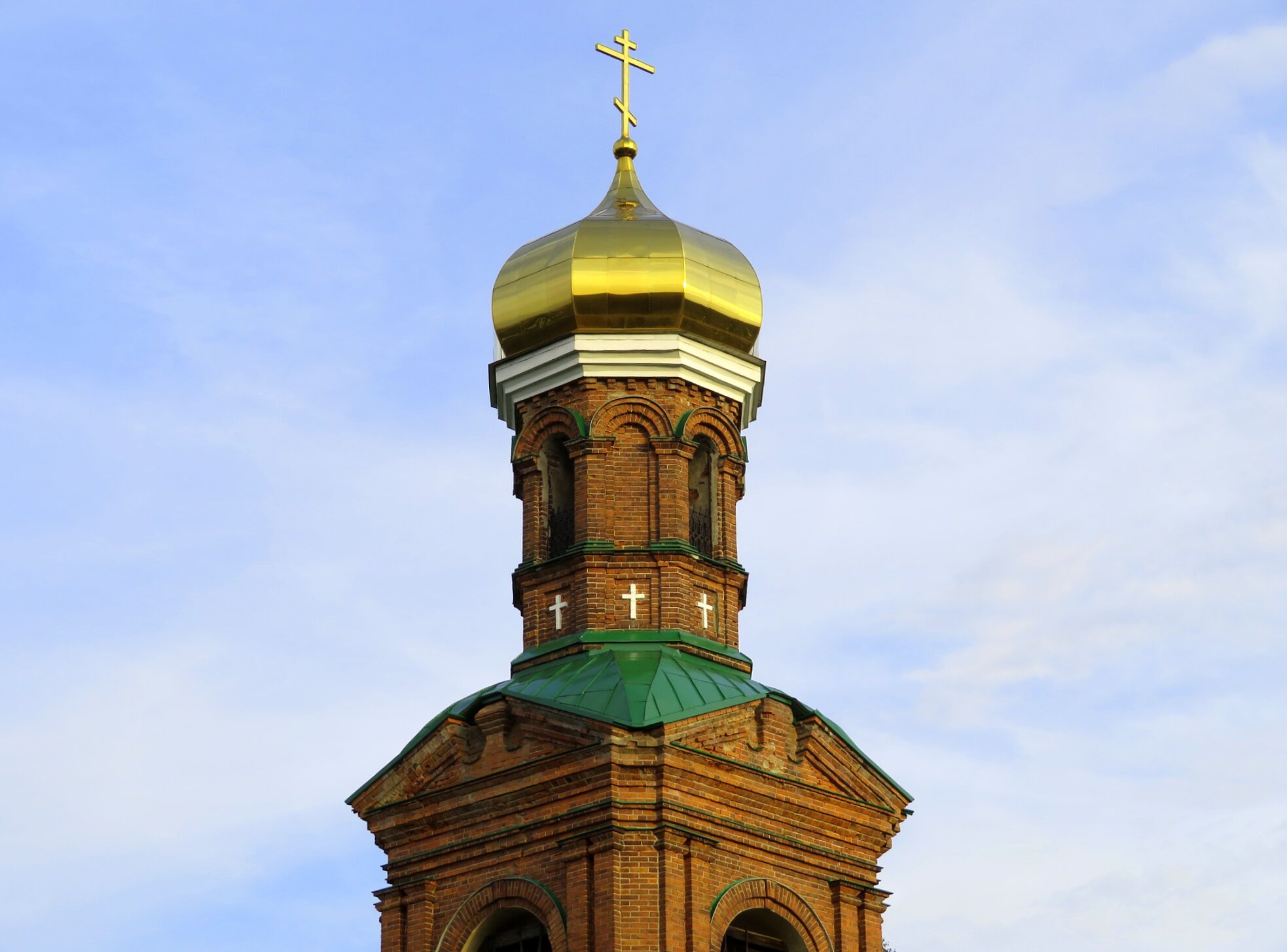 Колокольня, выполненная из красного кирпича, устремляется в небесную высь, увенчанная зелёной главкой и сияющей золотом луковичной маковкой, на которой гордо воздвигнут святой православный крест. Её стройный силуэт доминирует над окружающим пейзажем, служа видимым напоминанием о божественном присутствии в этом месте.