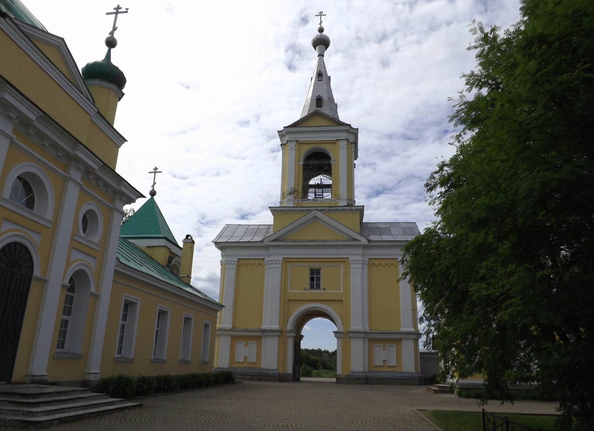 На фотографии запечатлена колокольня со святыми вратами Введено-Оятского женского монастыря, одной из древнейших православных обителей земли Ленинградской. Монастырь, расположенный на берегу реки Ояти, ведёт свою историю с первой половины XV века и освящён в честь Введения во храм Пресвятой Богородицы.