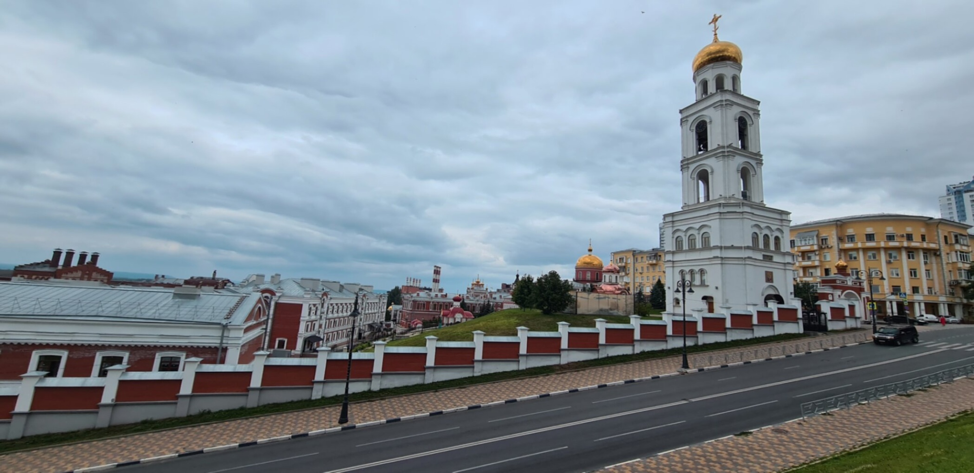 На фотографии запечатлена колокольня Самарского Иверского женского монастыря — одна из ключевых архитектурных доминант и духовных символов города. Монументальное белокаменное сооружение увенчано золочёной главой, сияющей в лучах солнца и символизирующей свет веры Христовой.