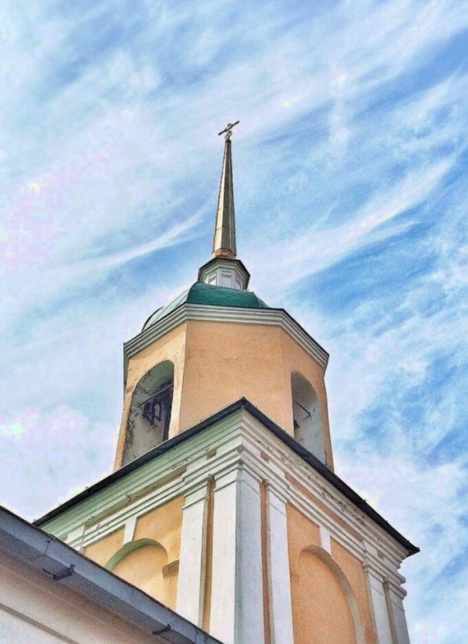 Фотография сделана с нижнего ракурса, что позволяет в полной мере оценить величие и высоту колокольни, её архитектурную доминанту в окружающем пространстве. На заднем плане видно безмятежное голубое небо с лёгкими перистыми облаками, что создаёт ощущение спокойствия и духовной возвышенности. Казанская церковь в Рязани продолжает оставаться местом молитвенного собрания верующих, а её колокольня — неотъемлемой частью сакрального ландшафта города.