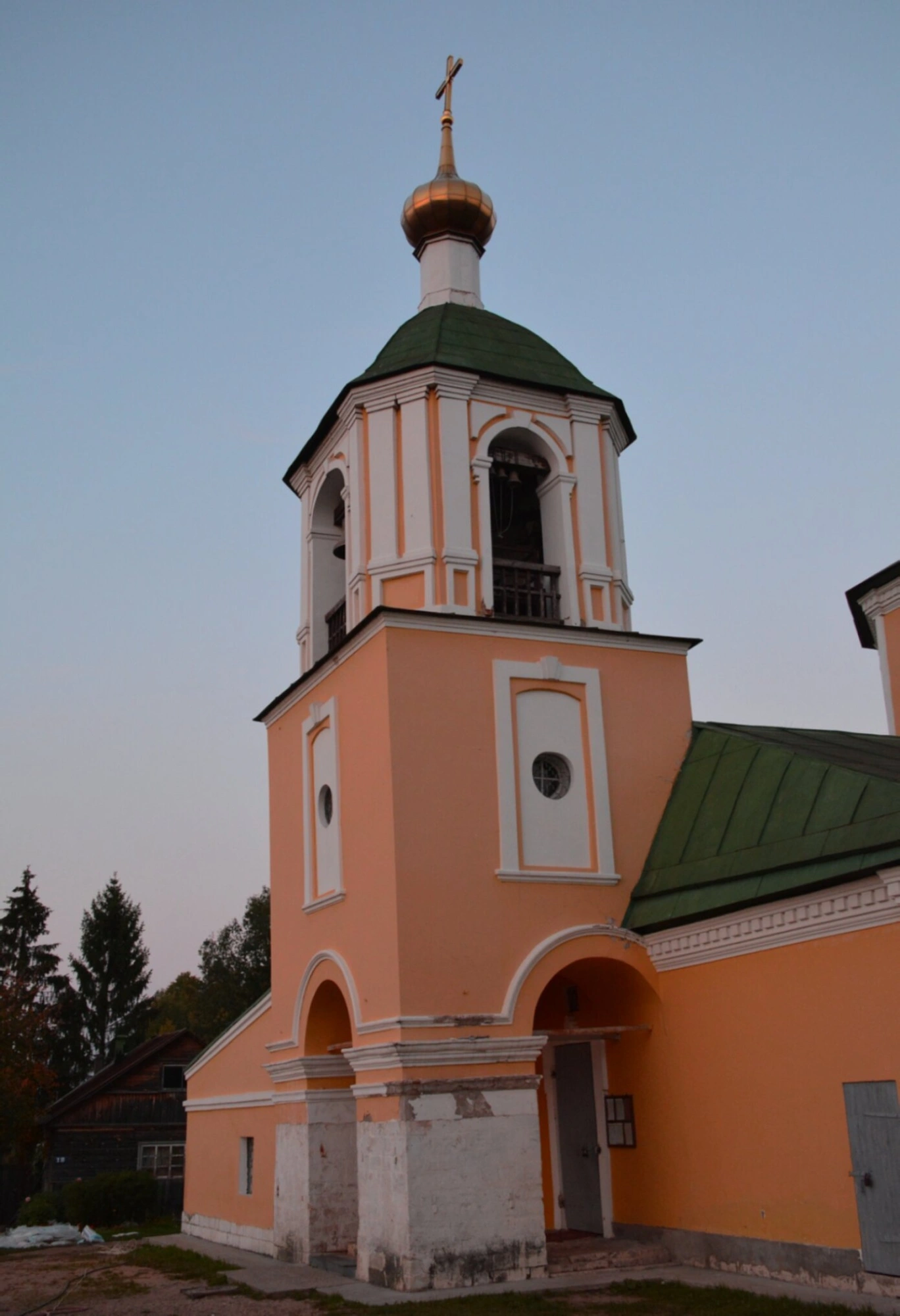 На фотографии запечатлена колокольня храма в честь Казанской иконы Божией Матери, расположенного в посёлке Власьево в черте города Тверь. Этот православный храм является памятником архитектуры федерального значения и обладает богатой историей, насчитывающей несколько столетий.