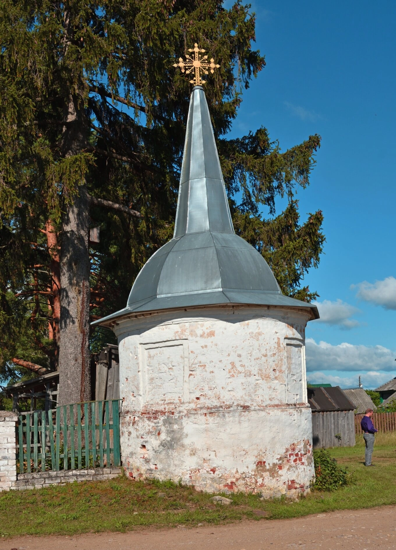 Белёные стены колокольни покоятся на кирпичном основании, что является традиционным для церковного зодчества Русского Севера. Рядом со святыней изображен человек, что позволяет оценить монументальность строения и его гармоничные пропорции. Архитектурный облик колокольни отражает особенности храмового строительства XVIII-XIX веков, когда подобные сооружения возводились как неотъемлемая часть церковных ансамблей.