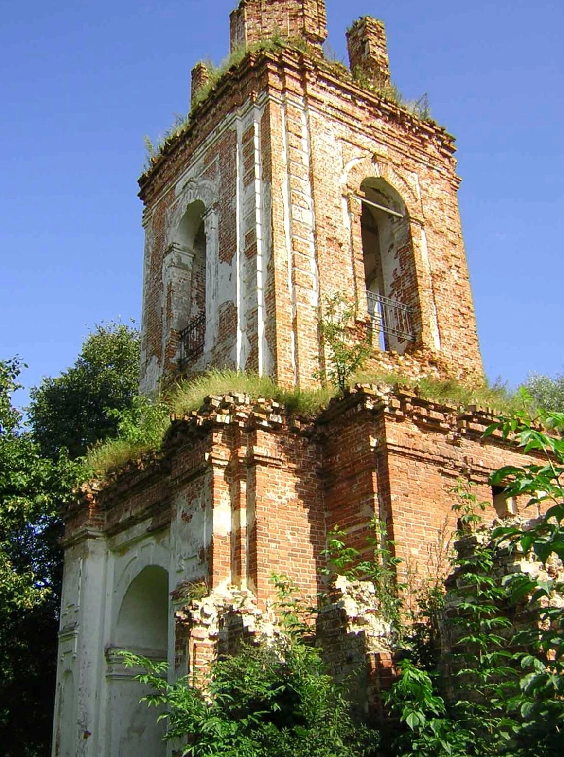 На фотографии запечатлена колокольня бывшего Клопского Свято-Троицкого монастыря, расположенного в Новгородской области близ Великого Новгорода. Это кирпичное сооружение, выполненное в традициях православной храмовой архитектуры, ныне пребывает в полуразрушенном состоянии. Колокольня обладает характерными арочными проёмами, где в прошлом размещались церковные колокола, призывавшие братию на молитву.